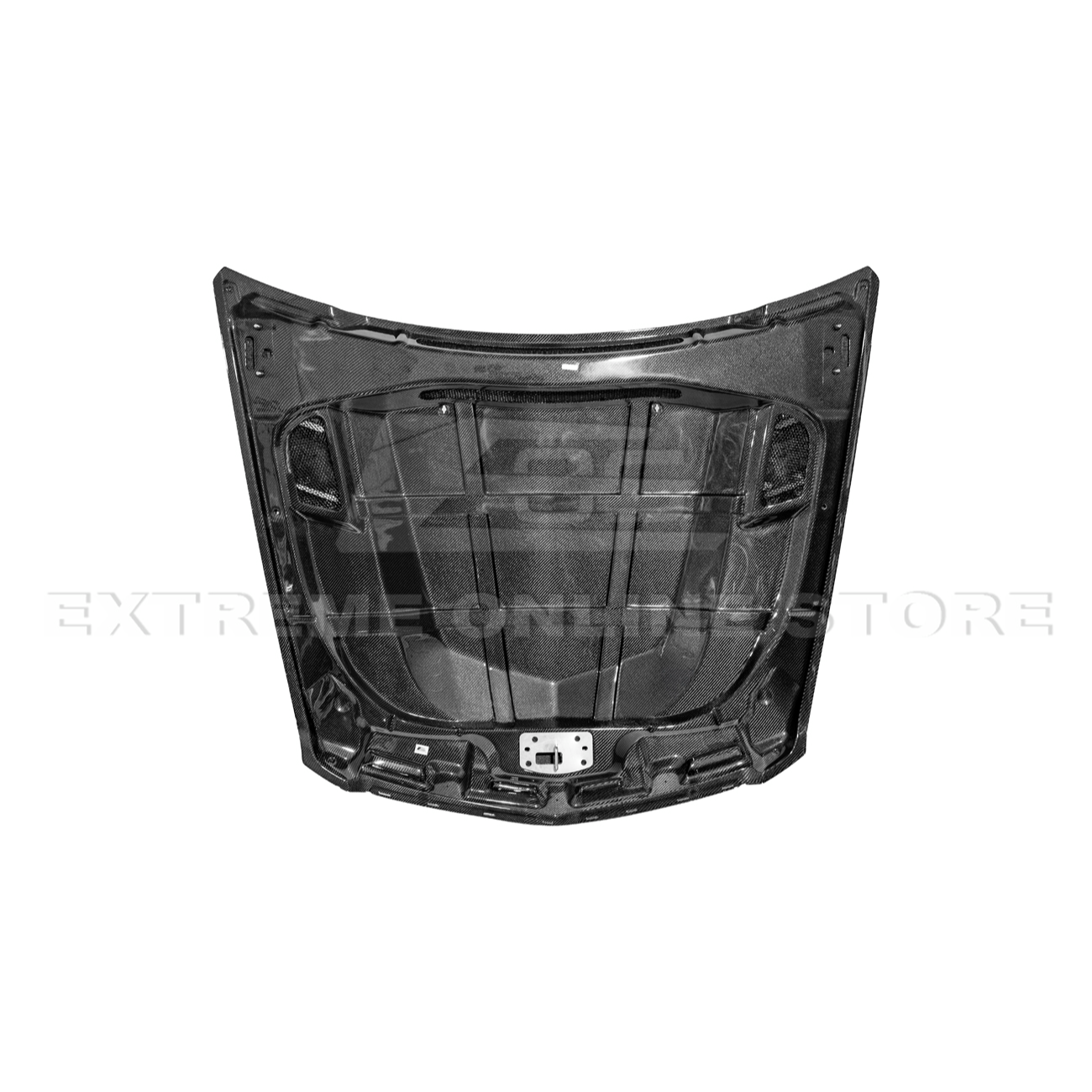 At the center of the hood is a raised middle vented heat extractor, designed to evacuate trapped hot air from the engine bay. This functional vent helps reduce heat soak, supports more stable intake air temperatures, and improves overall cooling efficiency—especially critical for supercharged CTS-V models running higher boost, spirited driving, or track use.