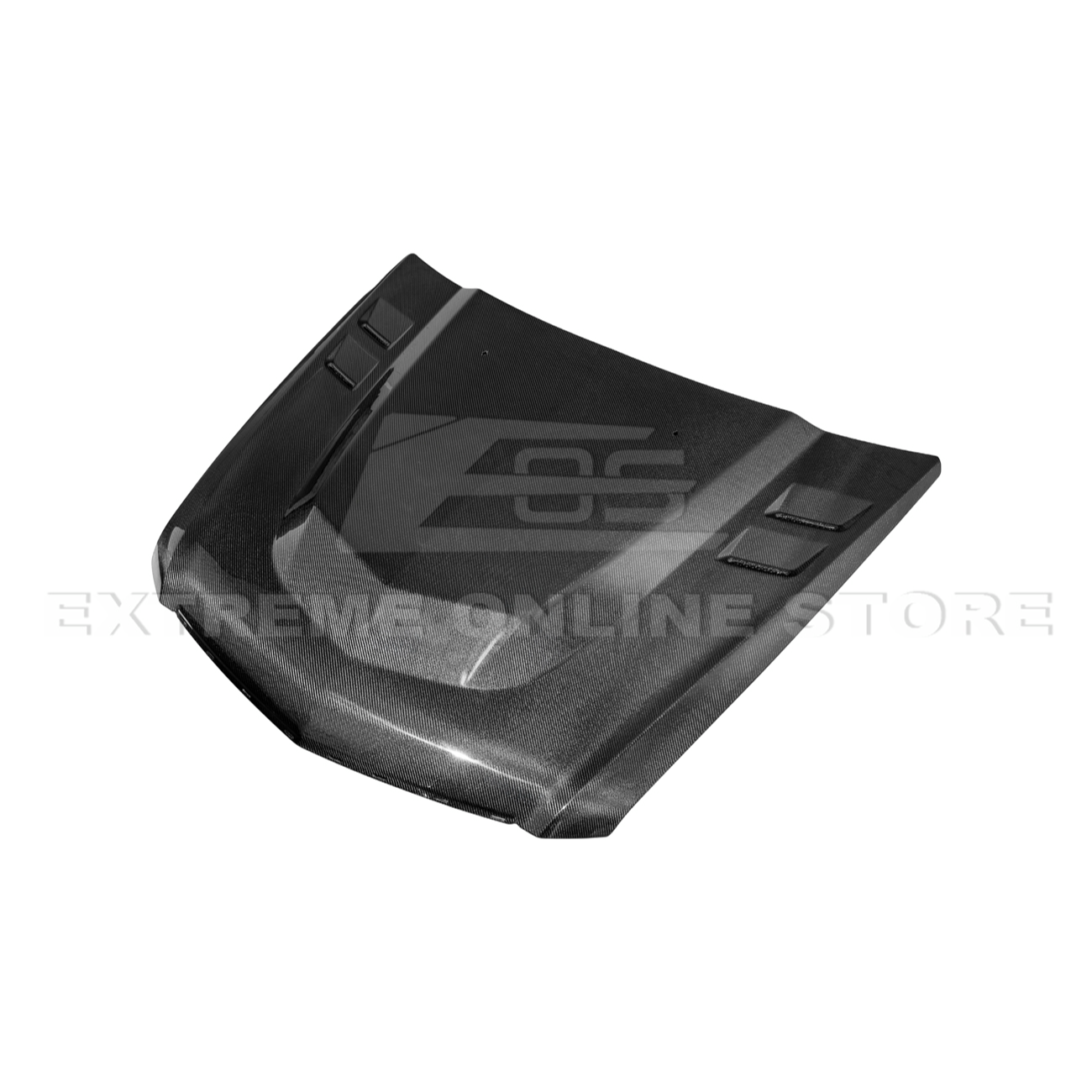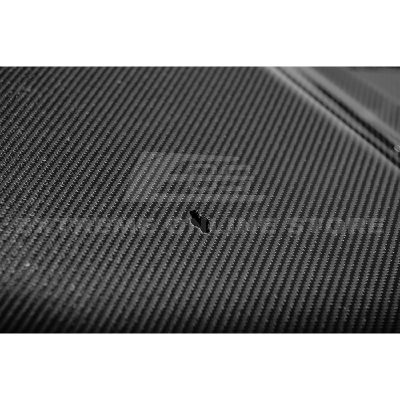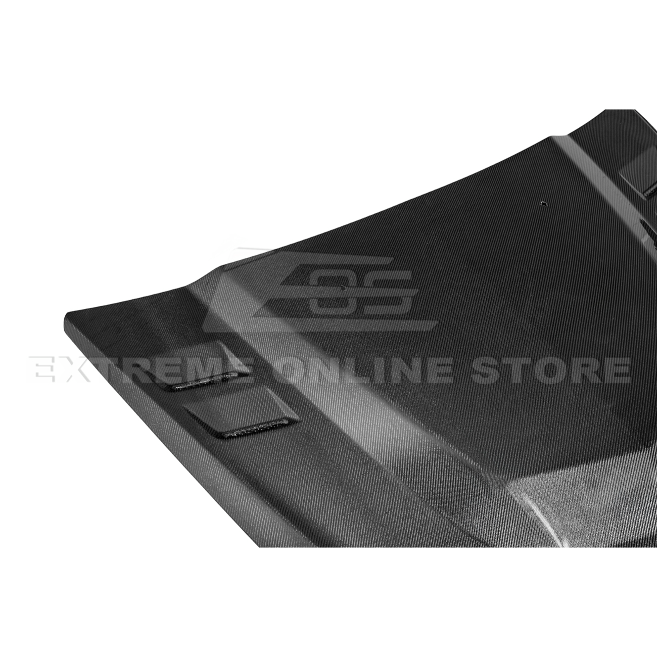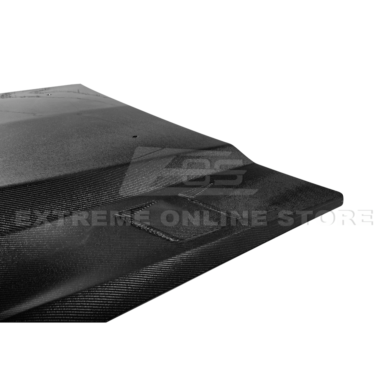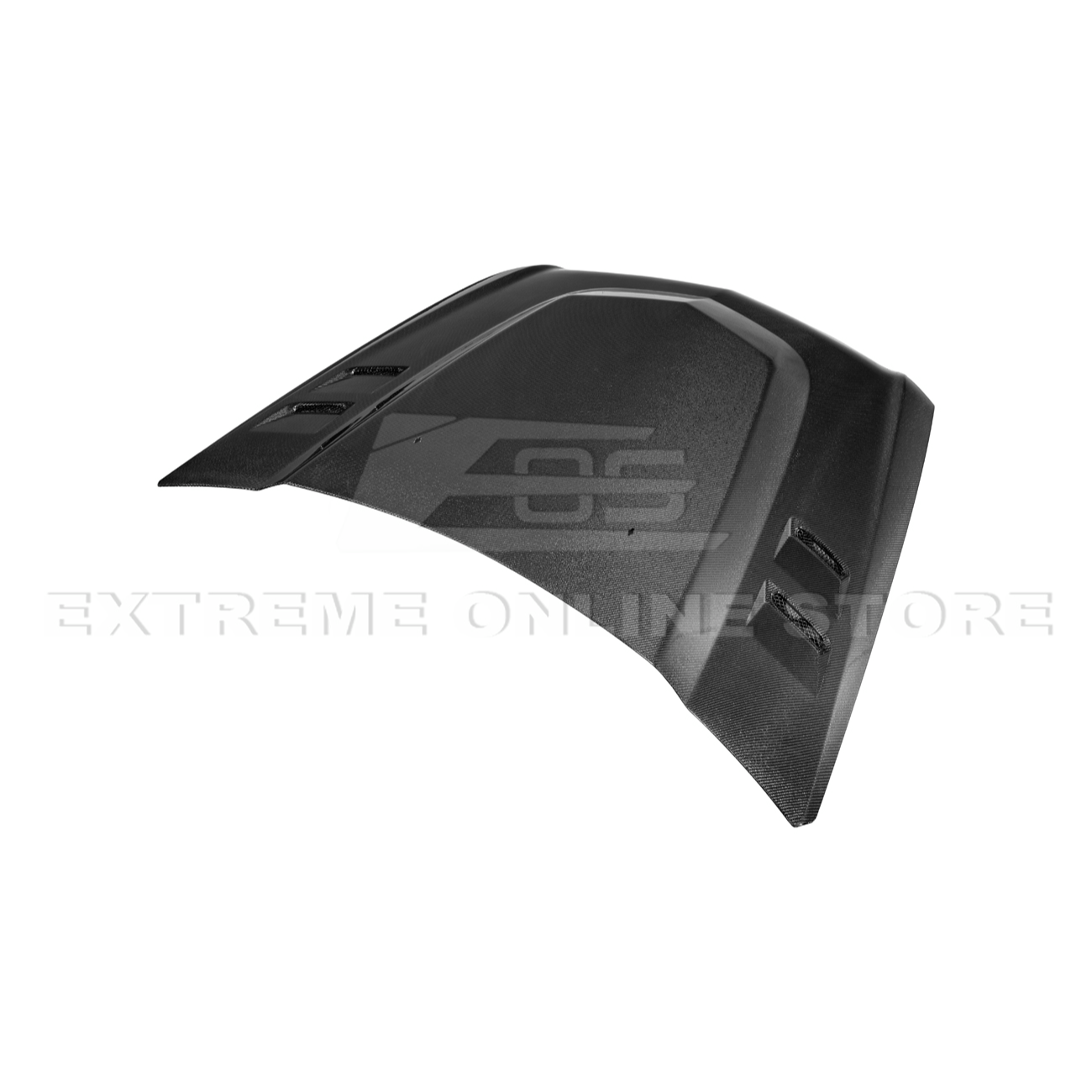 Lighter than factory aluminum or steel hoods, improving front-end weight distribution and handling response. -