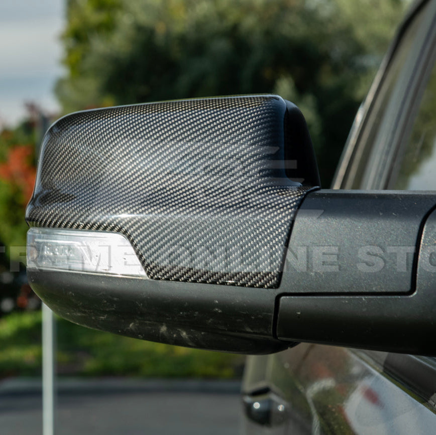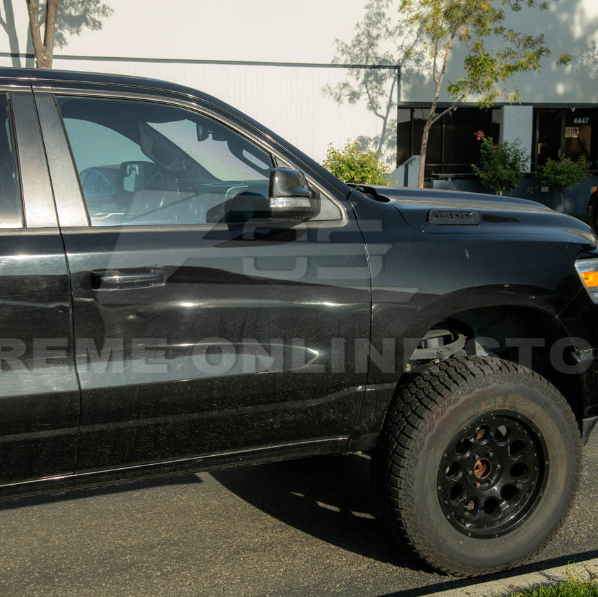 The 19-Up Ram 1500 Carbon Fiber Side Mirror Covers are built to elevate the truck’s exterior while maintaining OEM styling. Crafted from genuine 3K twill weave carbon fiber, they provide a lightweight, high-strength enhancement with a sophisticated motorsport-inspired finish. These mirror caps feature factory-style contours to ensure seamless integration with the original mirror housings, preserving the clean, OEM-plus appearance. Tape-on installation requires no permanent modification, making it perfect for daily drivers or show vehicles. A UV-resistant clear coat helps protect against fading and environmental wear, maintaining the premium carbon fiber look over time. Quick and easy to install, these mirror covers instantly upgrade the exterior with minimal tools or effort. Ideal for Ram 1500 owners seeking a subtle yet striking carbon fiber accent, they are perfect for enhancing both style and perceived value without compromising function.