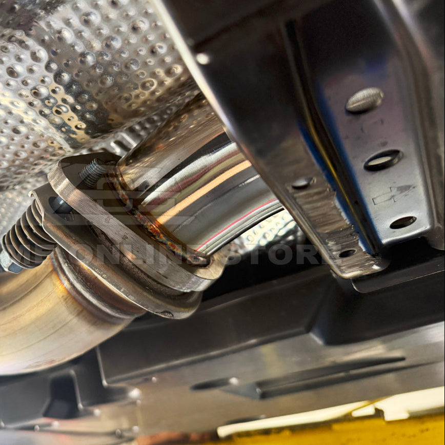 Hand-crafted TIG welding ensures strong, clean welds that maintain structural integrity and prevent leaks under high exhaust temperatures. The precision-formed design allows this mid pipe to bolt directly into the factory exhaust location, ensuring proper alignment and consistent fitment. Its non-resonated configuration pairs well with both OEM and aftermarket axle-back exhaust systems, giving drivers flexibility in building their ideal exhaust setup. This mid pipe is perfect for GR Corolla owners seeking a louder, more responsive exhaust without sacrificing build quality or compatibility.