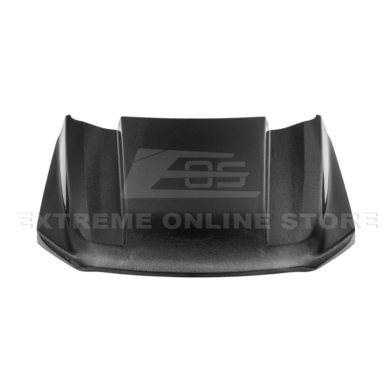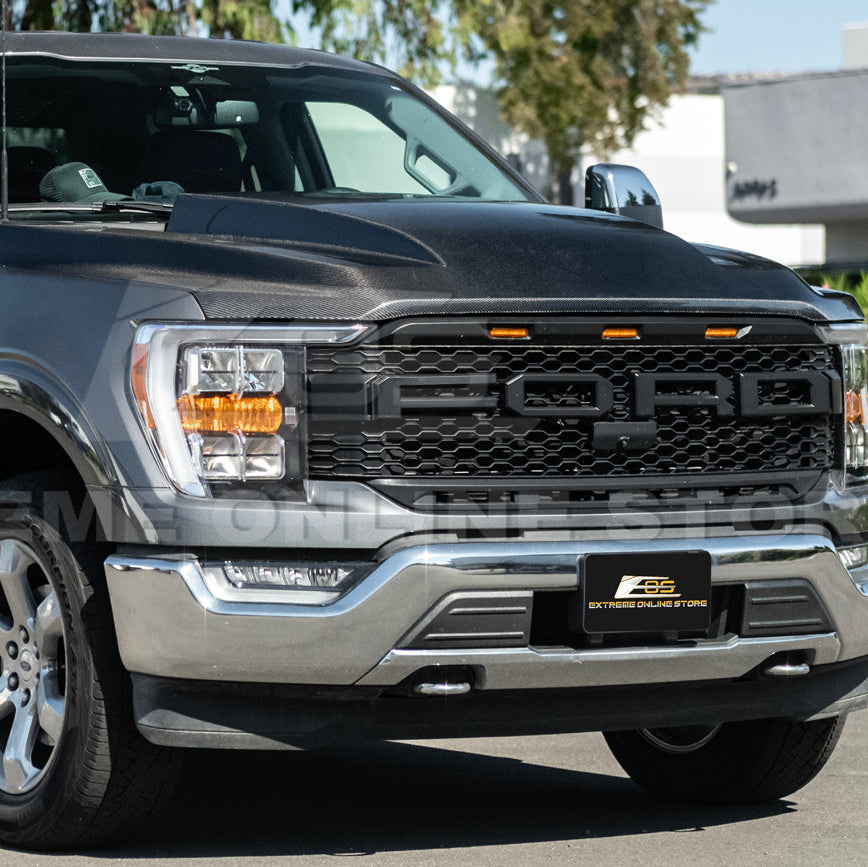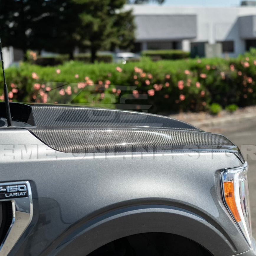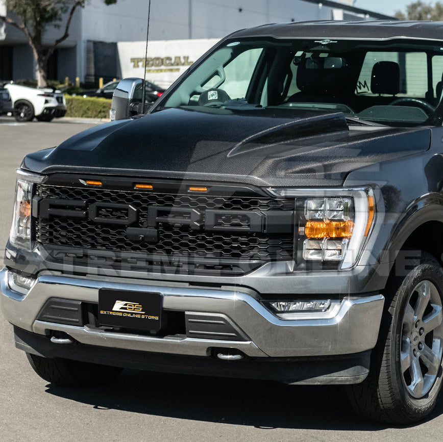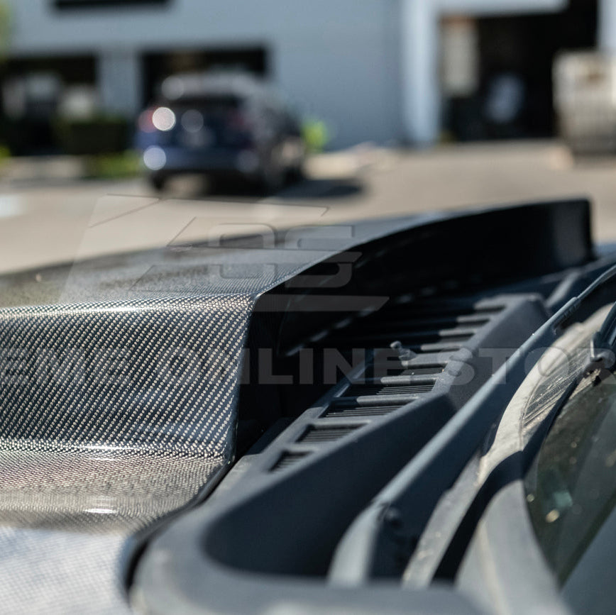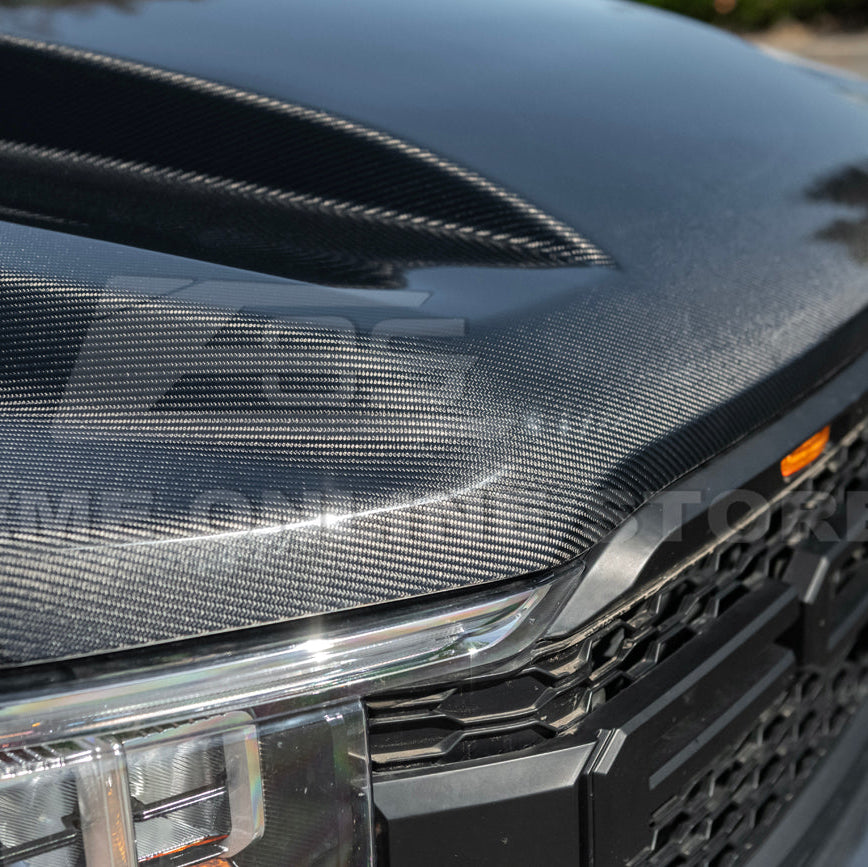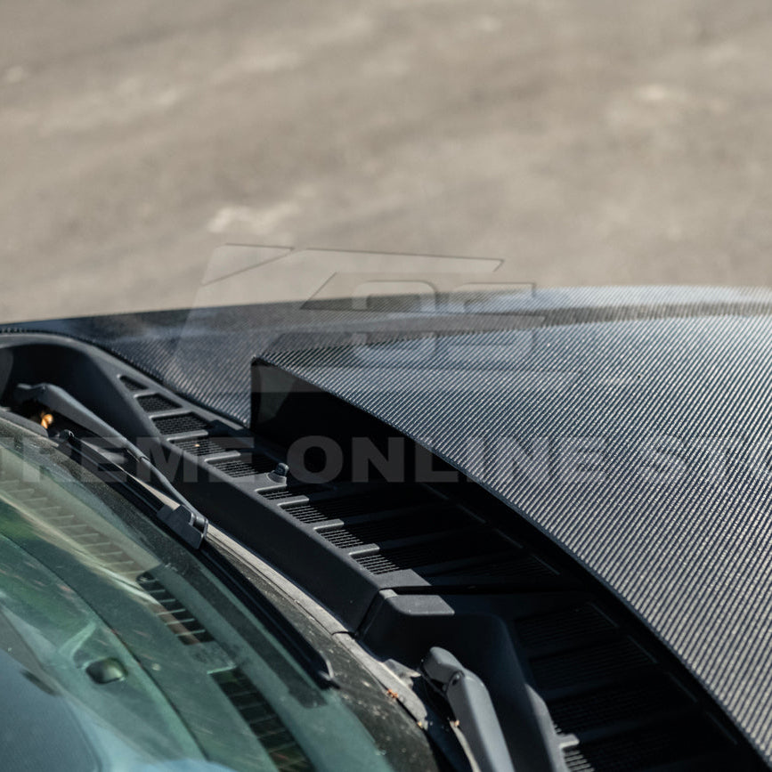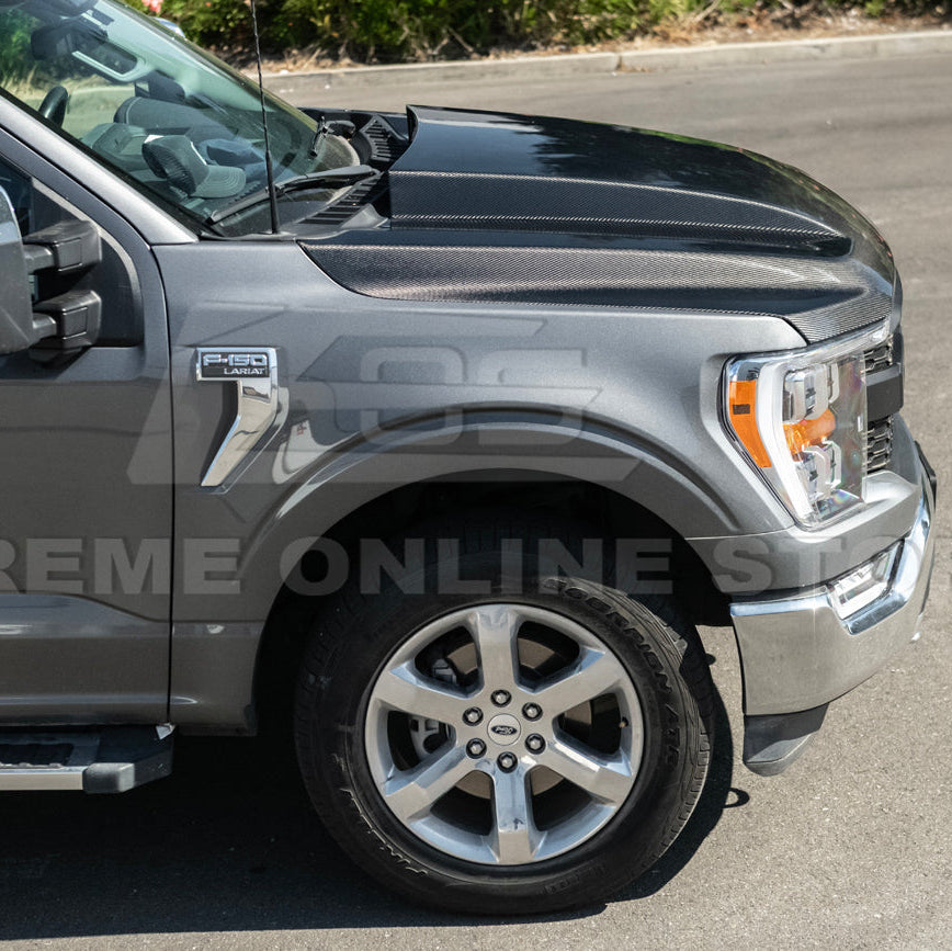Vehicle Compatibility – Designed exclusively for 2021–Up Ford F-150 models to ensure a seamless integration with factory hood contours and front-end body lines. EOS Performance Package Design – Aggressive Front-End Styling enhances the front hood cowl area with a bold, performance-inspired profile for a commanding road presence. Real Carbon Fiber Construction – Manufactured from genuine carbon fiber to provide superior rigidity, lightweight properties, and long-term durability. 3K Twill Weave Finish – Features a high-quality 3K twill weave carbon fiber pattern for a premium, motorsport-inspired visual finish. Precision OEM Fitment – Molded using OEM geometry to guarantee accurate alignment, smooth panel transitions, and consistent gaps. Direct Bolt-On Installation – Installs directly onto factory mounting points without cutting, drilling, or permanent modifications. Factory Mounting Points – Compatible with OEM hardware for secure, straightforward installation. UV-Resistant Clear Coat – Protects the surface from UV exposure, fading, and environmental wear. Enhanced Front-End Visual Depth – Adds contrast and dimension to the hood and front fascia while maintaining OEM proportions. Ideal for Street & Performance Builds – Suitable for daily-driven trucks, performance builds, or show vehicles looking for a refined carbon fiber upgrade.