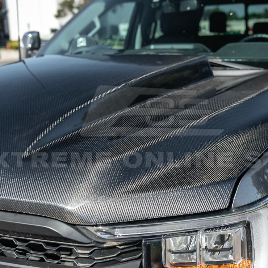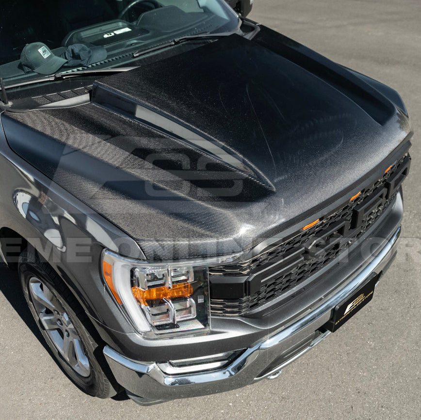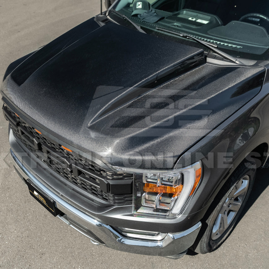 The 21-Up Ford F-150 | EOS Performance CARBON FIBER Front Bumper Cowl Hood Cover is a premium exterior upgrade designed to elevate the appearance and presence of your Ford F-150. FITMENT Fits ALL 2021-Present Ford F-150 Models (Does NOT Fit F-150 Raptor Models). CONDITION 100% BRAND NEW. STYLE EOS Performance Cowl Hood Style. MATERIAL 3K Twill Weave Real Carbon Fiber. SURFACE FINISH Carbon Fiber. PACKAGE INCLUDED 1 X Ford F-150 Models | Cowl Hood Style Carbon Fiber Front Bumper Hood Cover. Hardware is NOT included—reuse OEM hardware for installation.