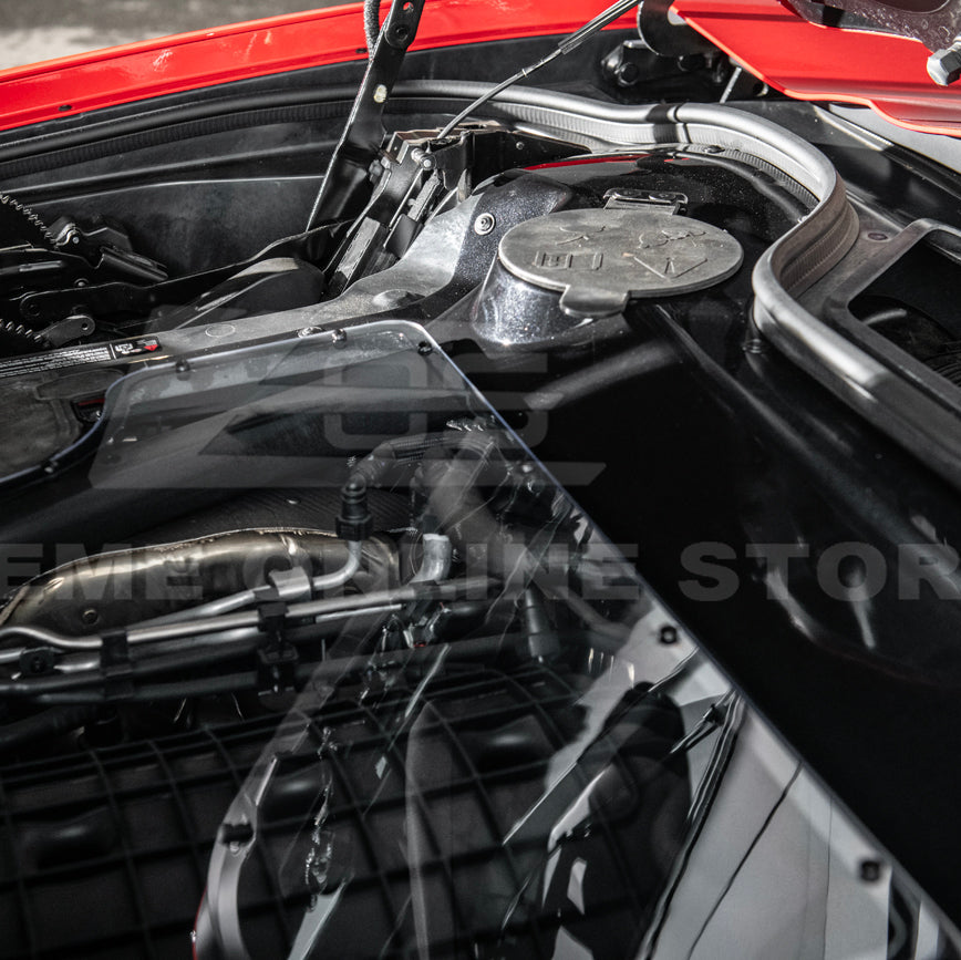 Features a distinctive grained center panel surrounded by exposed carbon fiber weave, creating a luxurious, high-contrast visual effect that elevates the C8’s engine bay.