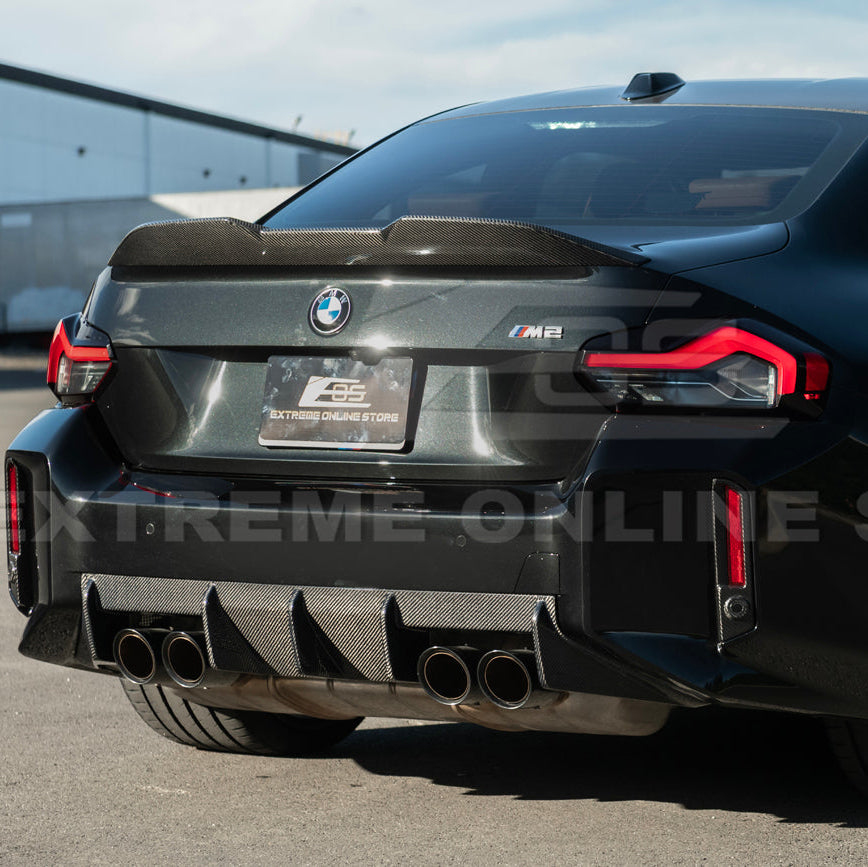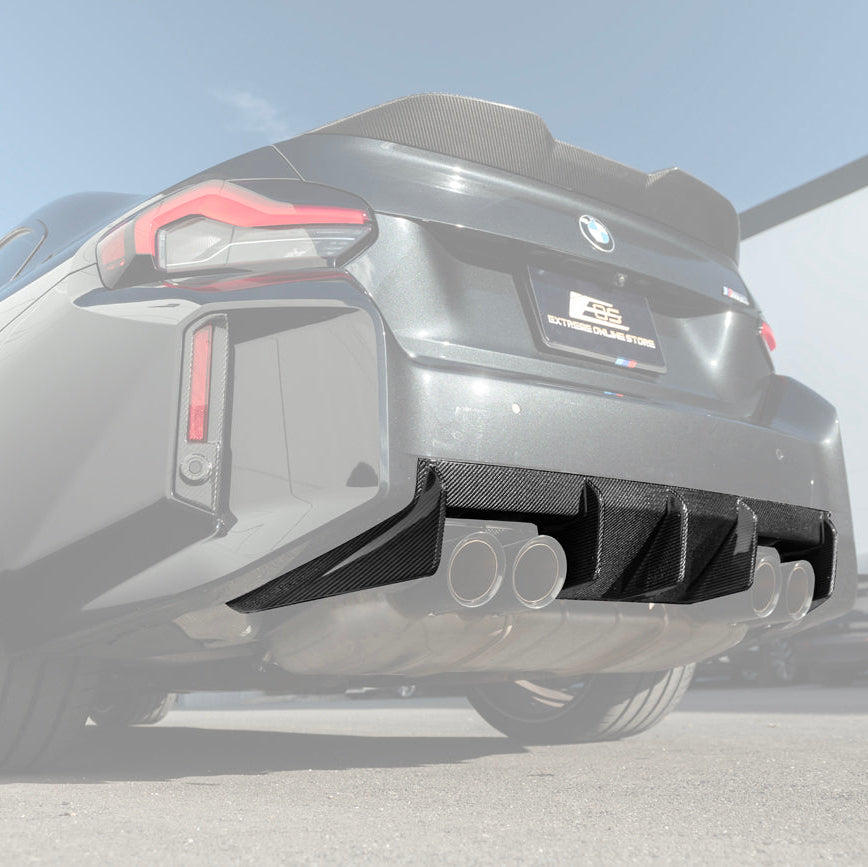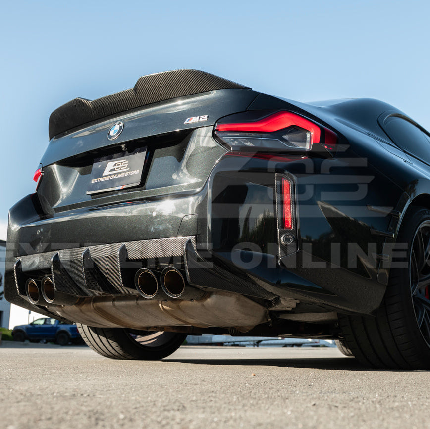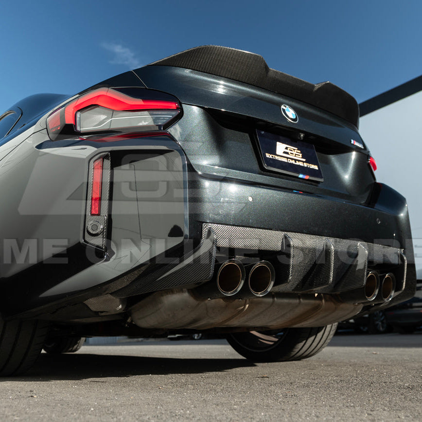 Upgrade your 2023-Present BMW G87 M2 with the M Performance V2 Carbon Fiber Rear Bumper Diffuser, crafted for BMW enthusiasts looking to enhance both style and aerodynamic performance. Compatible with all 2023 and newer BMW G87 M2 models, this diffuser is designed with precision to seamlessly integrate with your vehicle’s rear bumper for a clean, aggressive look. Made from high-quality carbon fiber, it provides a lightweight, rigid structure that elevates the car’s rear aesthetics while contributing to improved airflow management at high speeds. The M-Sport Performance V2 style diffuser accentuates the aggressive lines of the M2, giving it a track-inspired, premium appearance. Its clip-on design allows for direct installation using existing OEM hardware, making it a convenient upgrade without drilling.