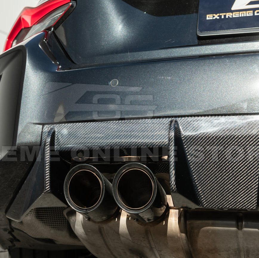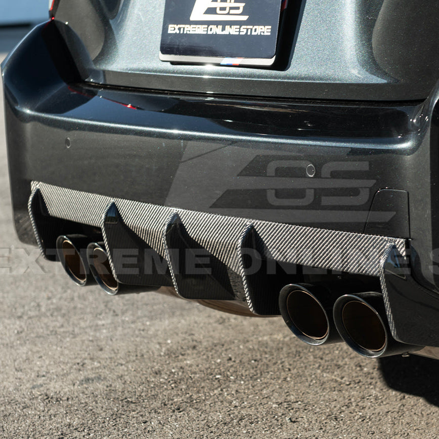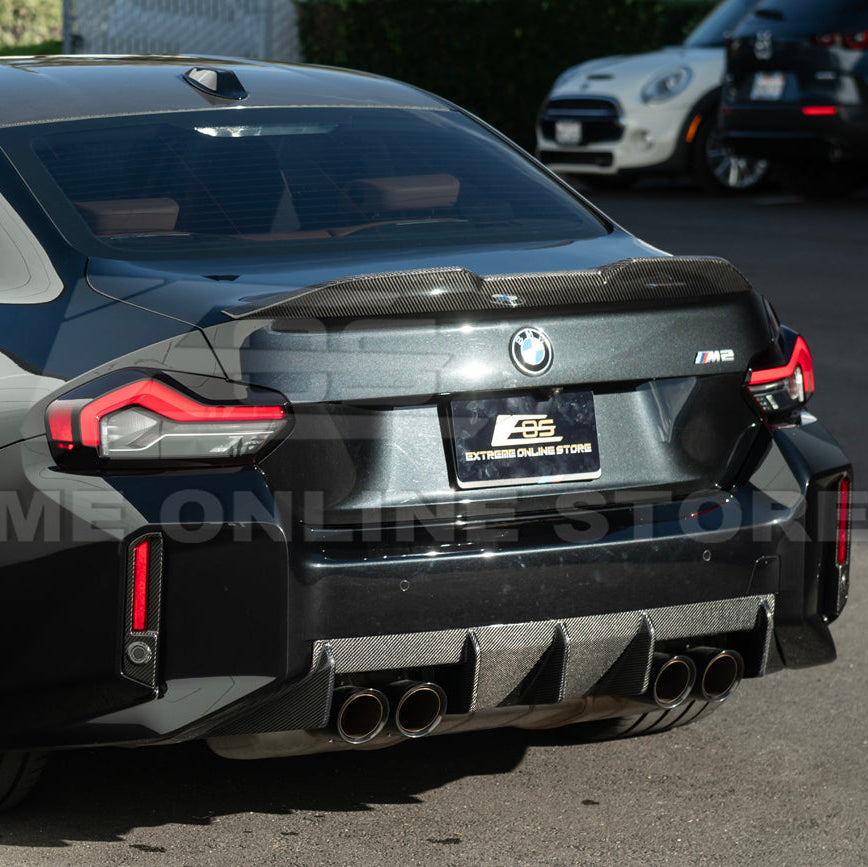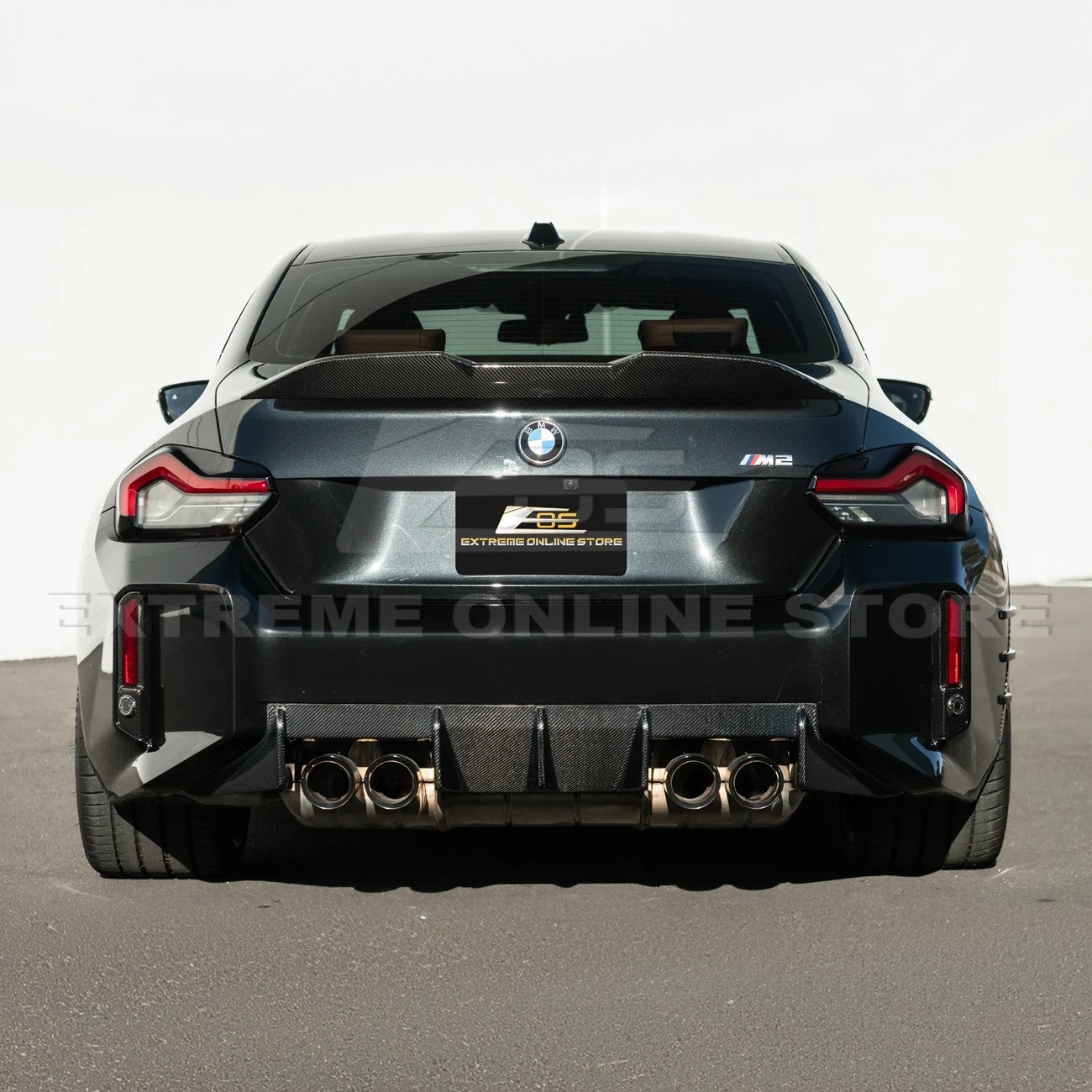 Upgrade your 2023-Present BMW G87 M2 with the M Performance V2 Carbon Fiber Rear Bumper Diffuser, crafted for BMW enthusiasts looking to enhance both style and aerodynamic performance. Compatible with all 2023 and newer BMW G87 M2 models, this diffuser is designed with precision to seamlessly integrate with your vehicle’s rear bumper for a clean, aggressive look. Made from high-quality carbon fiber, it provides a lightweight, rigid structure that elevates the car’s rear aesthetics while contributing to improved airflow management at high speeds. The M-Sport Performance V2 style diffuser accentuates the aggressive lines of the M2, giving it a track-inspired, premium appearance. Its clip-on design allows for direct installation using existing OEM hardware, making it a convenient upgrade without drilling.