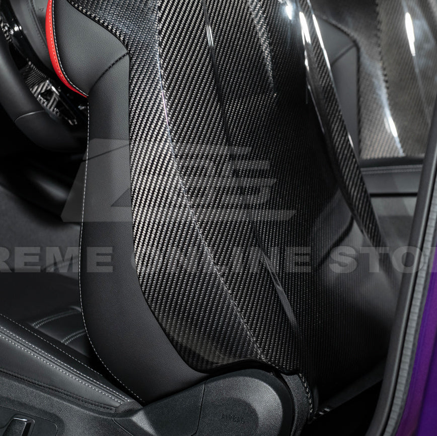 Installation is simple thanks to their OEM-fit design, direct tape-on setup, and included hardware. No cutting or drilling is needed, making this a stress-free way to elevate your interior. The package includes a complete left and right pair of dry carbon fiber seat back covers for all G8X models.
