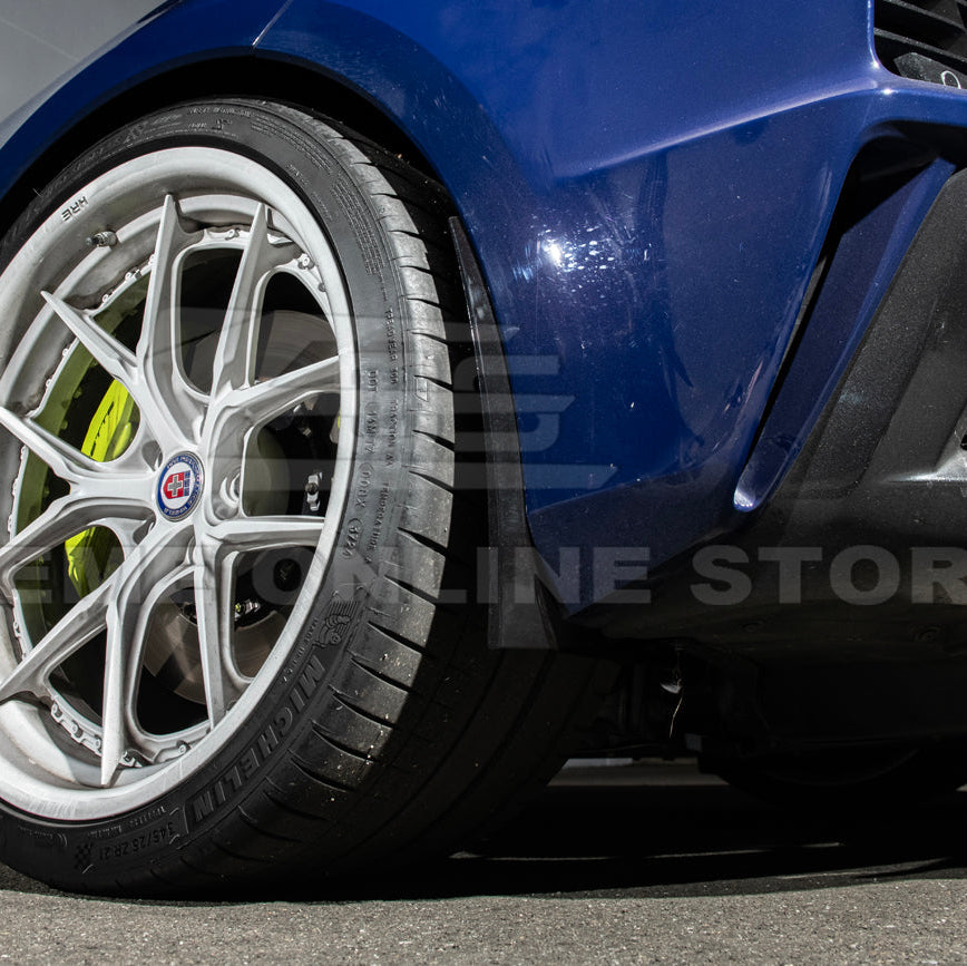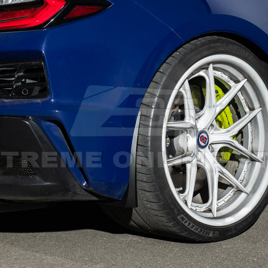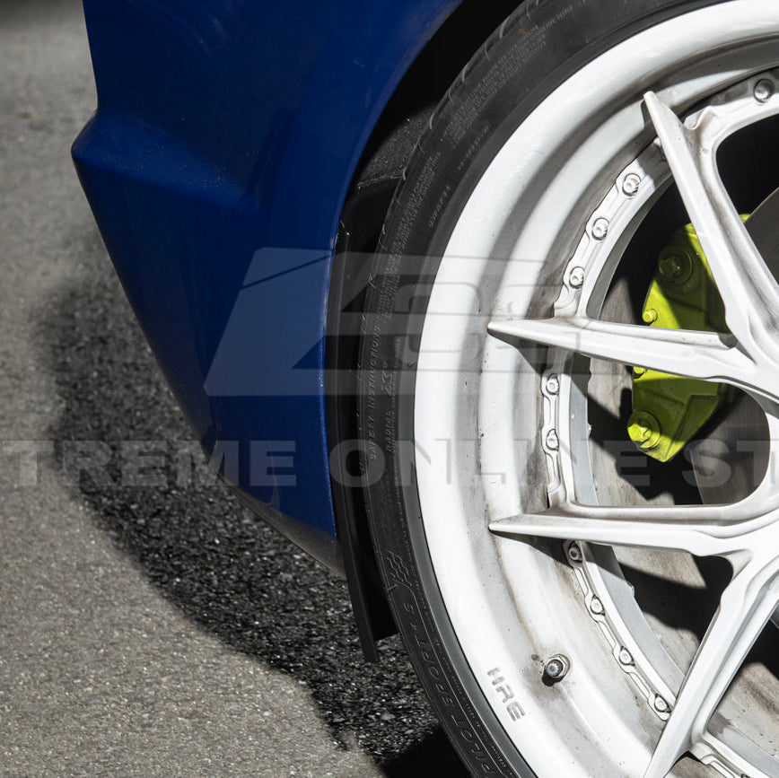 The 22-Up Corvette C8 Z06 XL Extended MATTE BLACK Rear Mud Flaps Splash Guards are designed to combine functionality with a sleek appearance. Featuring an XL extended design, these mud flaps nearly double the coverage of factory GM splash guards to provide enhanced protection against paint chips and debris. The bladed shield on the edge stops rocks and debris from directly entering the wheel well, reducing the risk of damage over time. Made from high-quality ABS plastic, the mud flaps offer long-lasting durability and resistance to road hazards. The matte black finish complements the sporty, aggressive styling of C8 Corvette Z06 and E-Ray models, maintaining a clean and modern aesthetic. Each set includes left and right flaps to ensure full rear-end protection and easy installation with reused OEM hardware. Perfect for owners looking to preserve the exterior of their Corvette while adding a subtle, performance-inspired design accent.