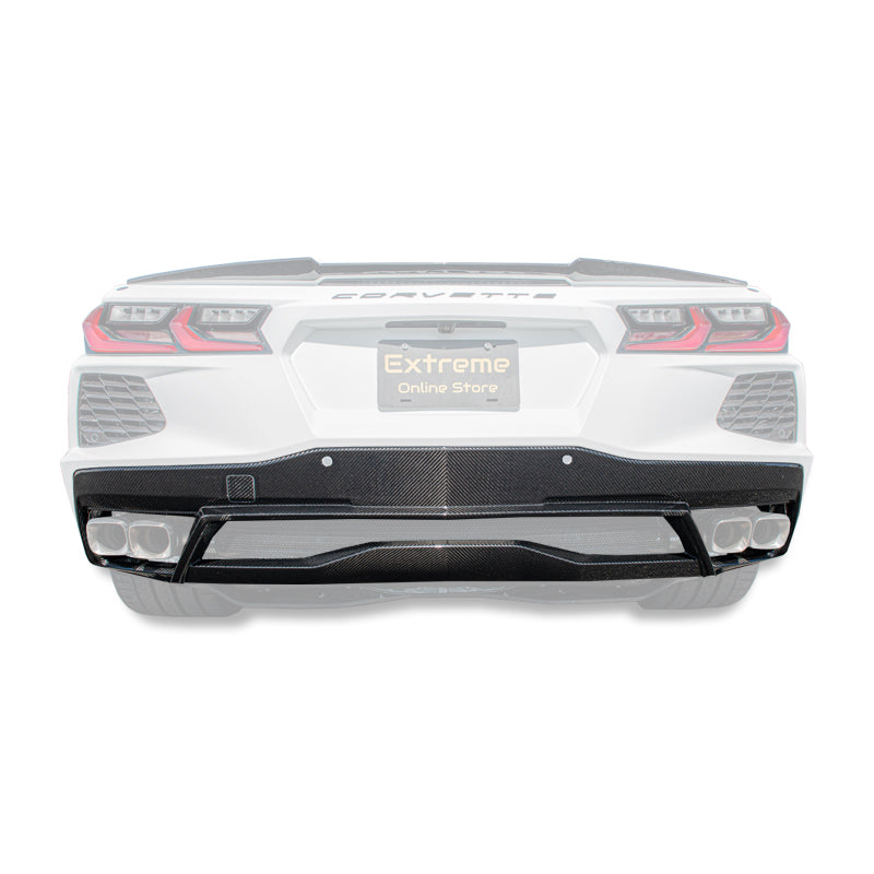 This diffuser fits seamlessly onto 2020–2026 Corvette Stingray, Z51, and E-Ray coupe and convertible models. Please note: this item does not fit Corvette C8 Z06 models. Each package includes one Corvette C8 GM Factory Style Carbon Fiber Replacement Rear Bumper Lower Diffuser.