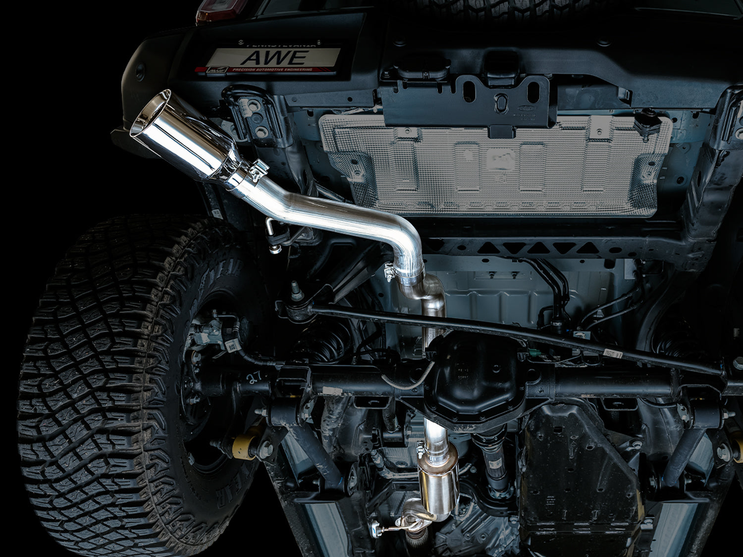 Handcrafted from US-made 3” T304L stainless steel, the 0FG Exhaust is a straight-through Cat Back configuration applicable to all Bronco models – 2.3T, 2.7TT, 2-door and 4-door – with modular capabilities unlike anything on the planet. The 0FG Exhaust features a bespoke AWE resonator in the mid pipe to produce an appropriate dose of aggression, followed by smooth bends towards the rear of the Bronco. On the way to the rear, depending on how many doors there are on your Bronco, lies an included adapter to bridge the difference in length across models. 2-door owner simply won't need these adapters, but 4-door owners will be thrilled. The 0FG modularity shines at the final breakpoint in the exhaust route. Not only does the 0FG accommodate various tip options, it also accommodates AWE’s BashGuard™. What’s BashGuard? Thanks for asking. The AWE BashGuard™ is included in every 0FG exhaust, and enables the 0FG to be the one exhaust to rule them all. Thanks to the modularity in the rear, simply remove the rear axle-back portion of the 0FG and replace it with the high-tuck BashGuard™. BashGuard™ is appropriately equipped with a .125” thick reinforced stainless ring. Perfect for bashin’. This version of the AWE Bronco Exhaust is the Single Side Exit: one big ‘n’ proud 5” double-walled tip in chrome silver, straight-cut tip exiting behind the left rear tire, adding a dose of aggression to the Bronco you never knew it needed. One exhaust. Every terrain.AWE's No CEL Guarantee, Perfect Fitment Guarantee, and Lifetime Warranty come standard.