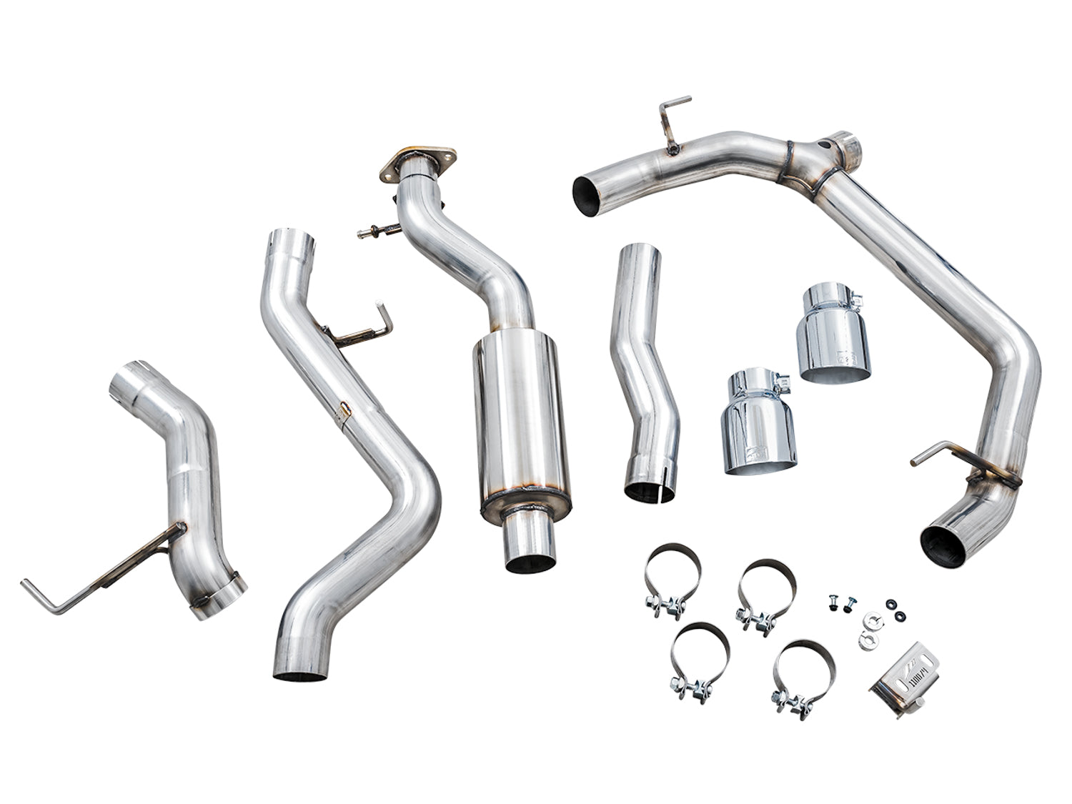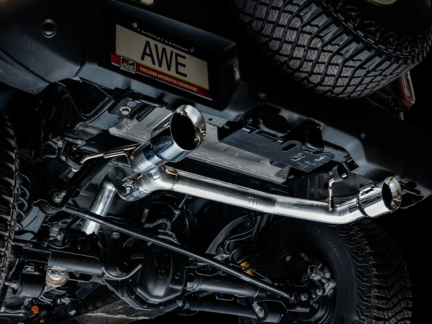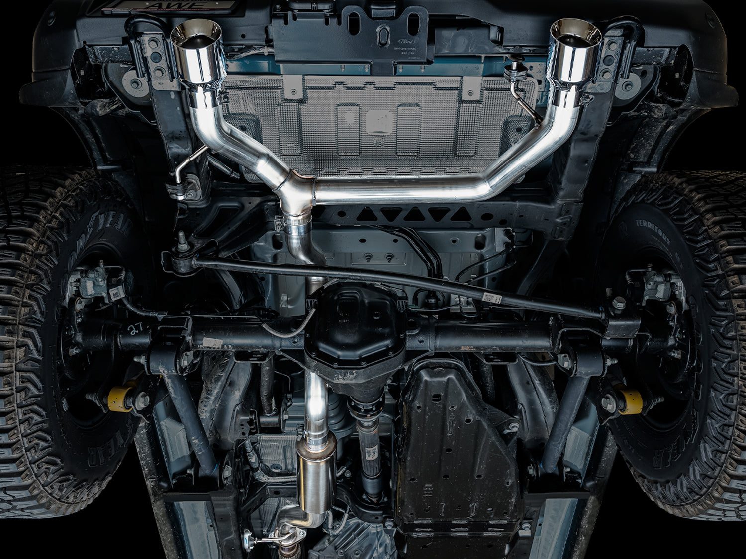 Handcrafted from US-made 3” T304L stainless steel, the 0FG Exhaust is a straight-through Cat Back configuration applicable to all Bronco models – 2.3T, 2.7TT, 2-door and 4-door – with modular capabilities unlike anything on the planet. The 0FG Exhaust features a bespoke AWE resonator in the mid pipe to produce an appropriate dose of aggression, followed by smooth bends towards the rear of the Bronco. On the way to the rear, depending on how many doors there are on your Bronco, lies an included adapter to bridge the difference in length across models. 2-door owner simply won't need these adapters, but 4-door owners will be thrilled. The 0FG modularity shines at the final breakpoint in the exhaust route. Not only does the 0FG accommodate various tip options, it also accommodates AWE’s BashGuard™. What’s BashGuard? Thanks for asking. The AWE BashGuard™ is included in every 0FG exhaust, and enables the 0FG to be the one exhaust to rule them all. Thanks to the modularity in the rear, simply remove the rear axle-back portion of the 0FG and replace it with the high-tuck BashGuard™. BashGuard™ is appropriately equipped with a .125” thick reinforced stainless ring. Perfect for bashin’. The Bronco Exhaust version you're checking out now is the Dual Split Rear Exit -- dual 4.5” double-walled, slash-cut Chrome Silver tips exiting below the rear bumper. This configuration adds needed symmetry to the Bronco’s very asymmetrical bumper, and it was engineered with aftermarket bumpers in mind. And remember, every kit comes with the AWE BashGuard™.One exhaust. Every terrain. No CEL Guarantee, Perfect Fitment Guarantee, and Lifetime Warranty come standard.