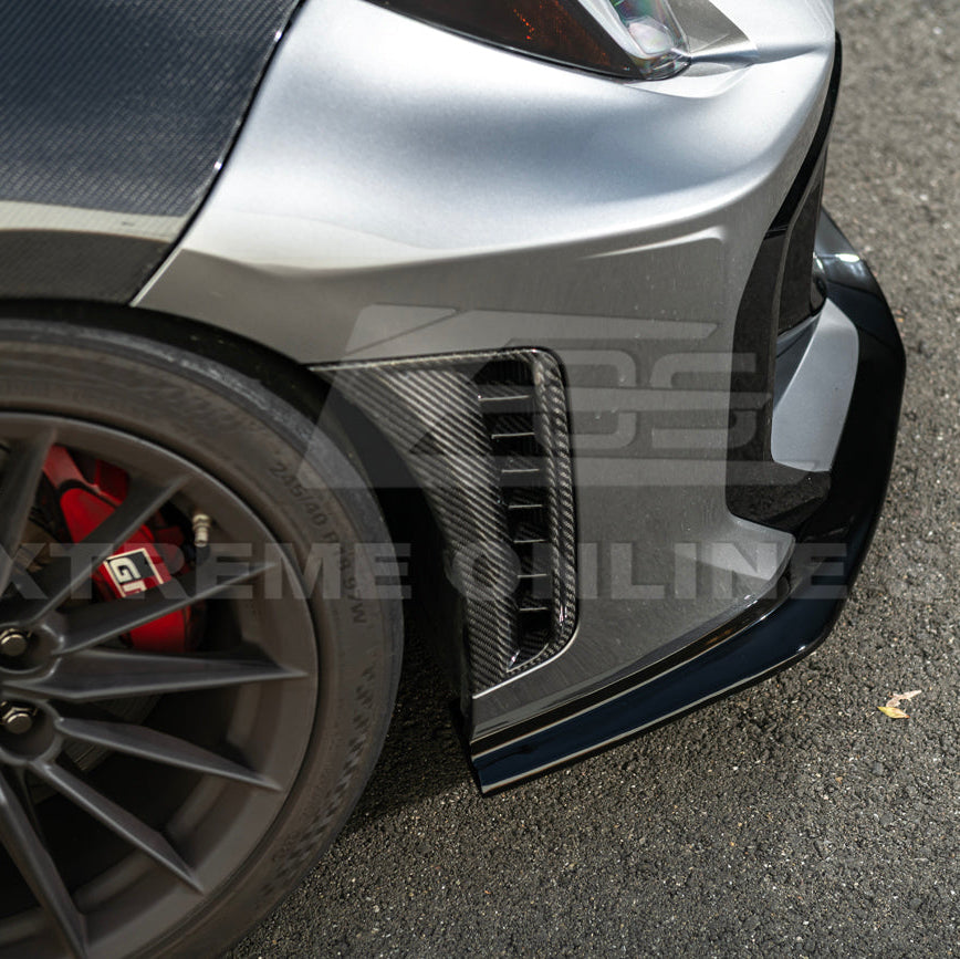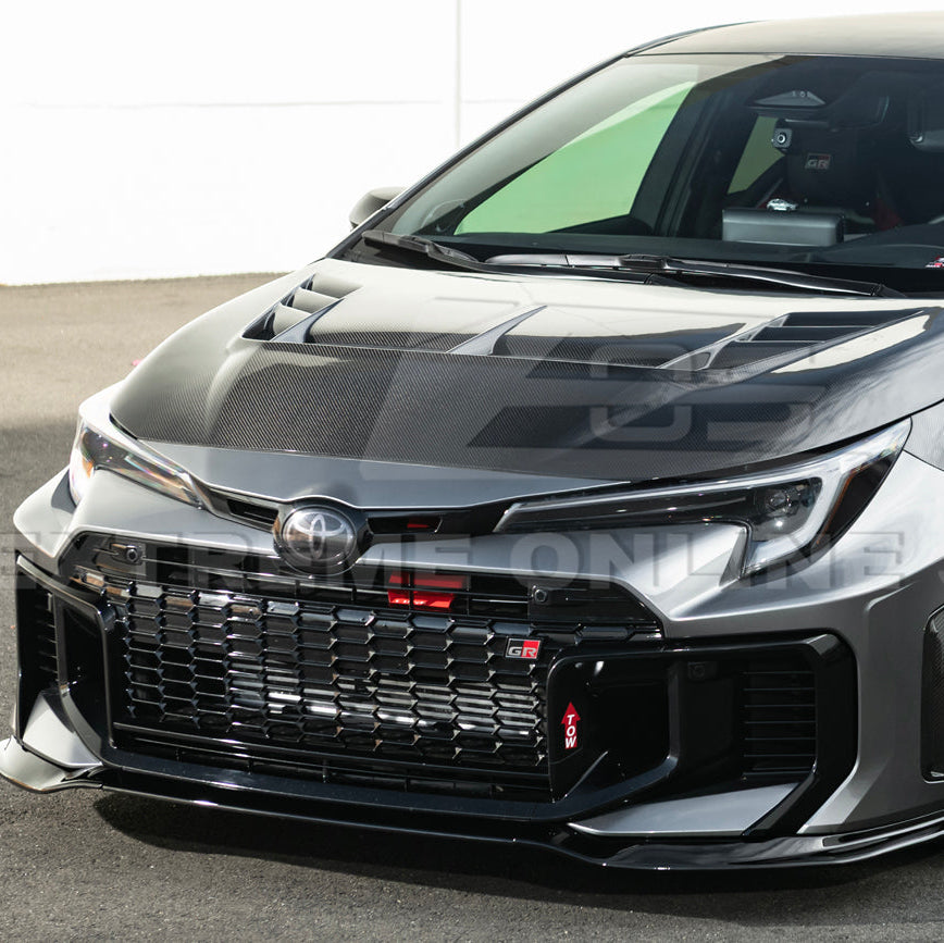 Each splitter is hand-finished for a mirror-like carbon weave pattern that adds visual depth and luxury to your GR Corolla’s front end. The fitment follows OEM specifications for a factory-like installation that requires no cutting or modification. The durable clear-coated finish helps protect against UV rays, moisture, and road debris, maintaining that high-gloss look for years.