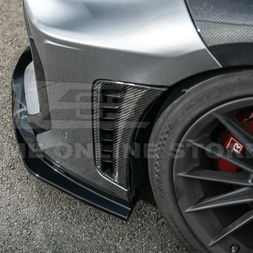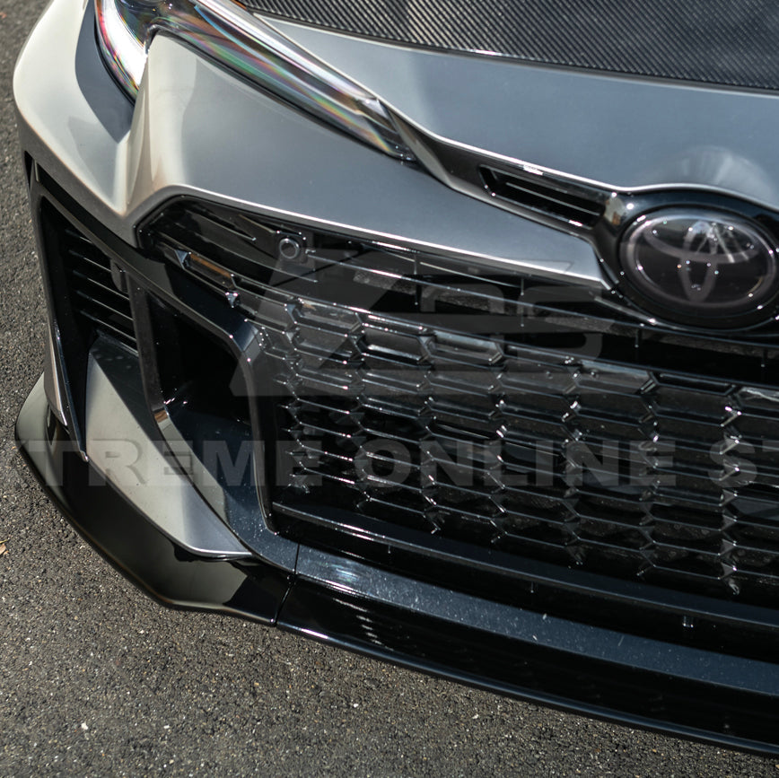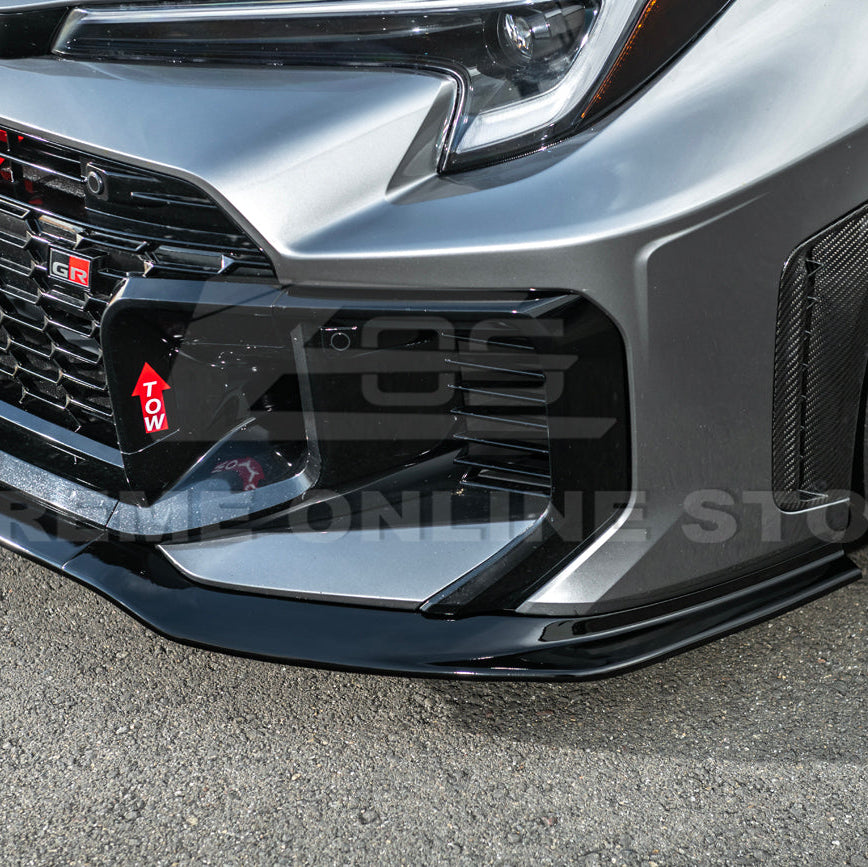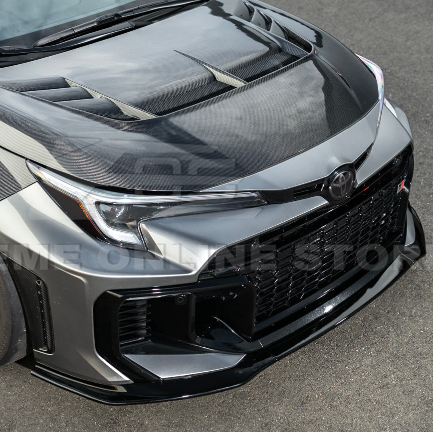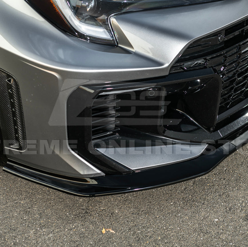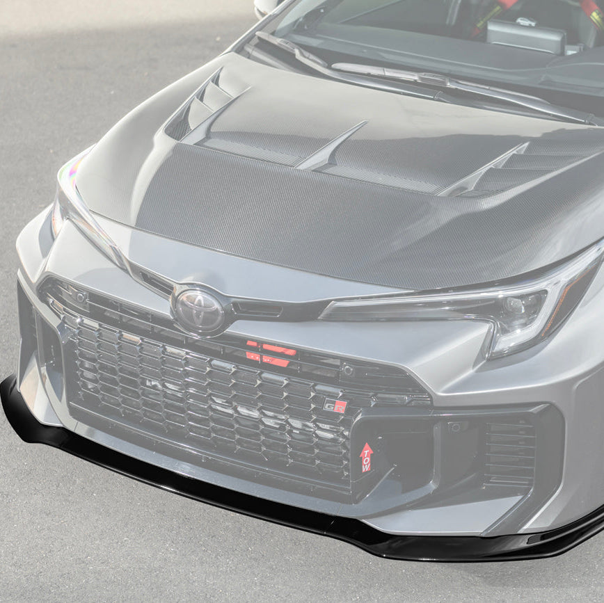 The 2025-Up Toyota GR Corolla GR Style 3PCs Carbon Fiber Front Splitter Lip Kit combines lightweight construction with cutting-edge aerodynamic design. Built from premium-grade carbon fiber, this splitter offers exceptional rigidity while keeping weight to a minimum, improving both handling and performance. The GR-inspired design channels airflow efficiently to reduce front-end lift, increase stability, and provide a sportier driving experience.