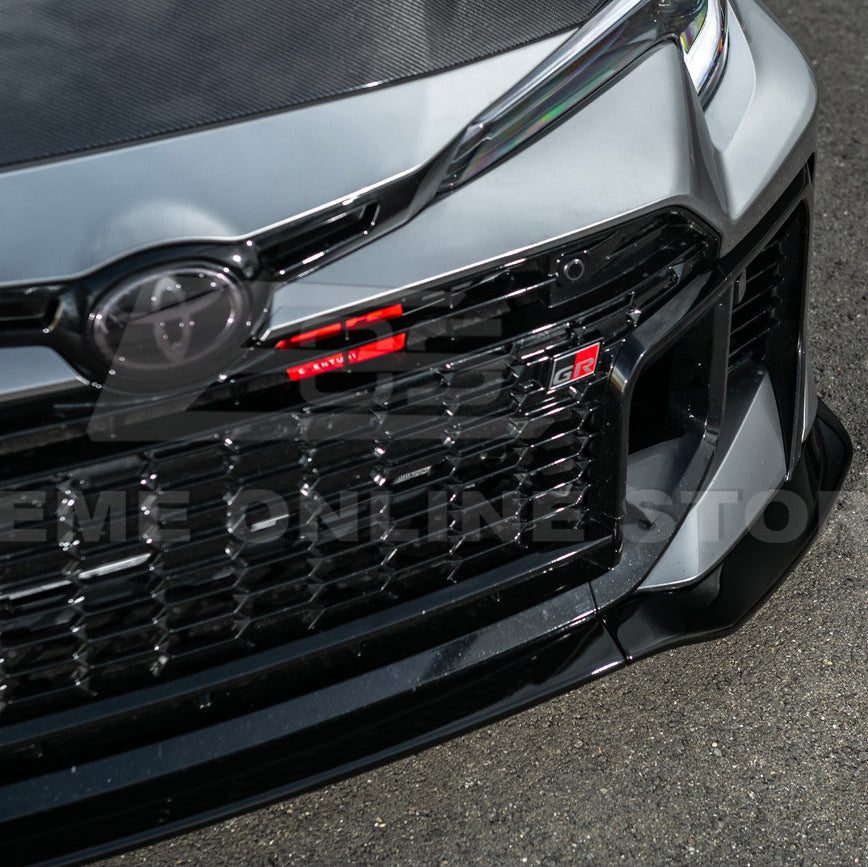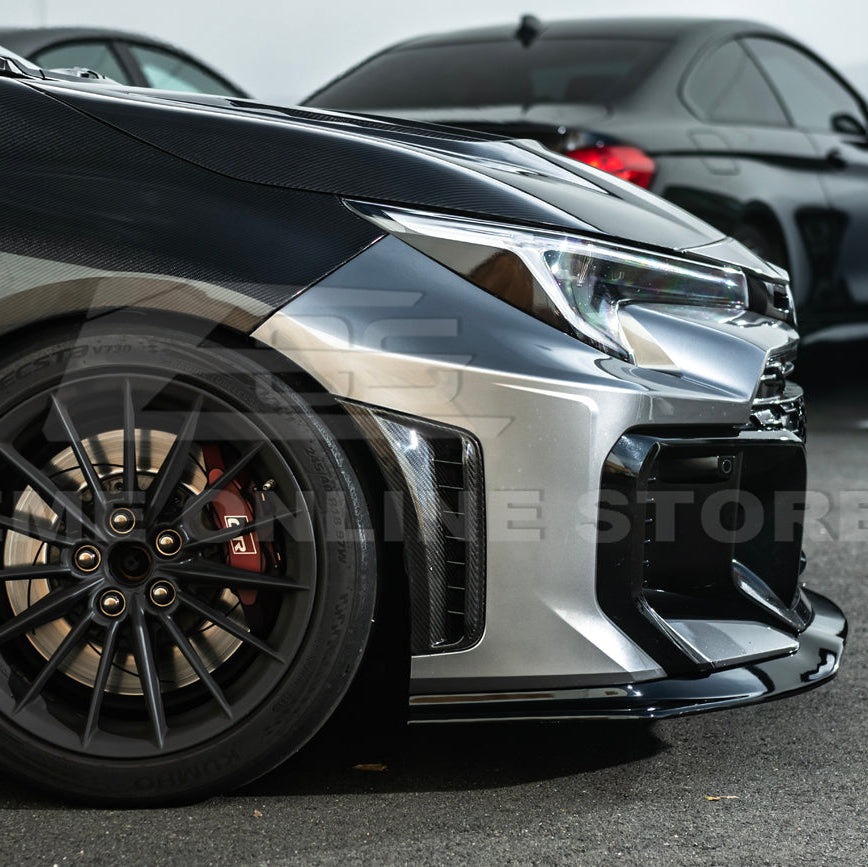 Each package includes 1 Toyota GR Corolla GR Style 3-Piece Carbon Fiber Front Bumper Lip Splitter and 1 Bag of Hardware for a complete, direct bolt-on installation. The splitter comes with pre-drilled mounting points, allowing you to re-use existing factory holes for a secure and seamless fit. With its high-gloss carbon finish and sharp aerodynamic profile, this front lip perfectly complements the aggressive lines of the GR Corolla, giving it a true motorsport-inspired aesthetic that looks right at home on the street or track.