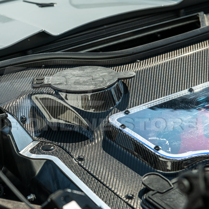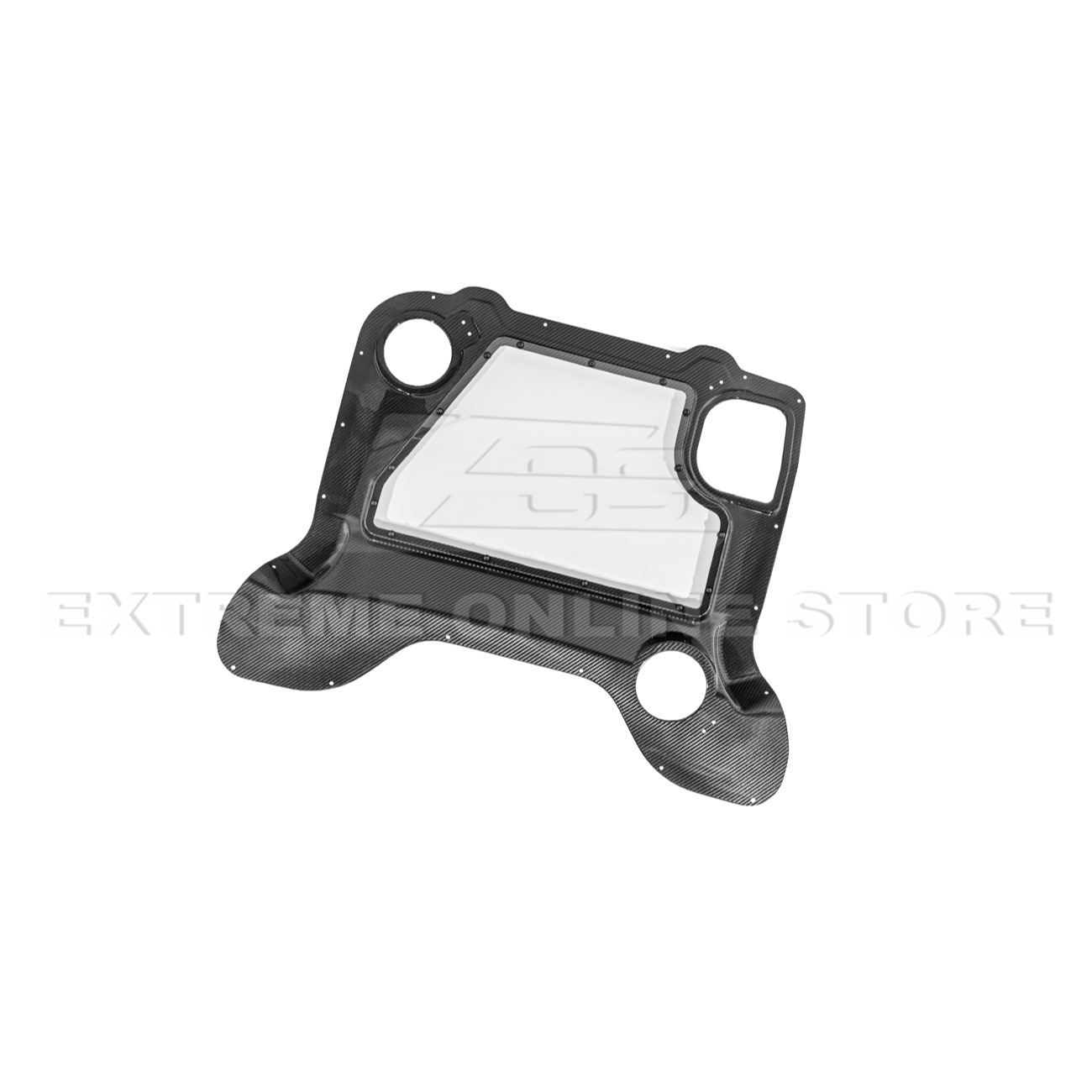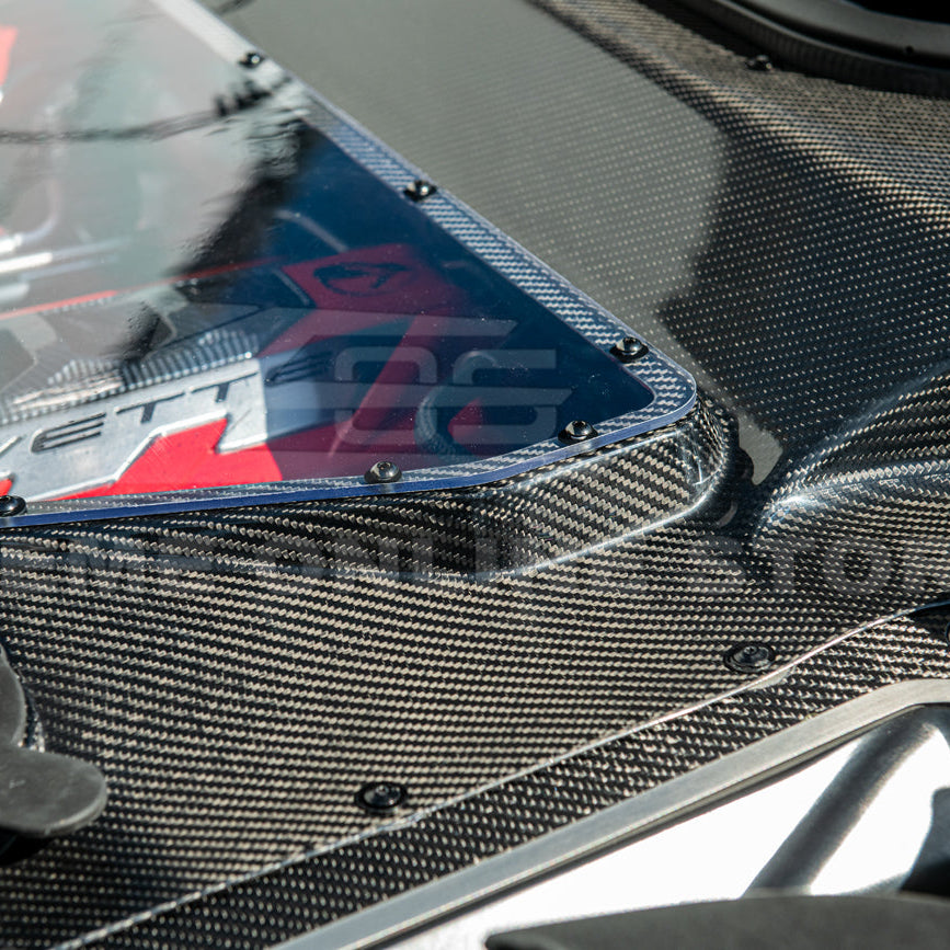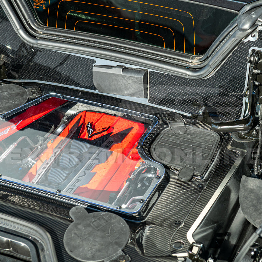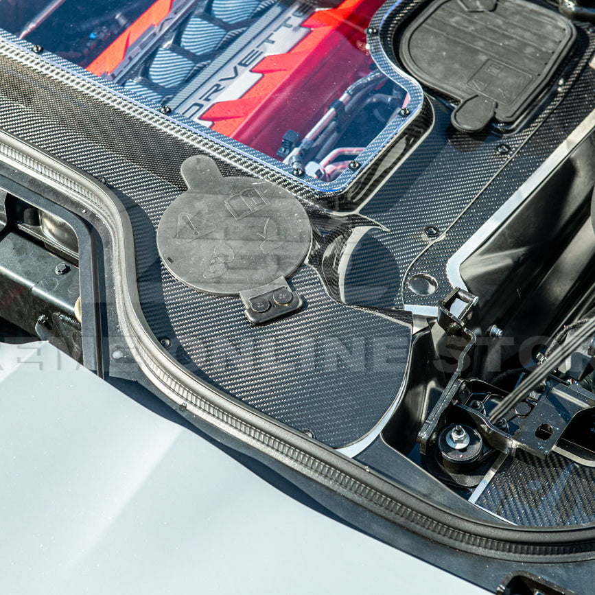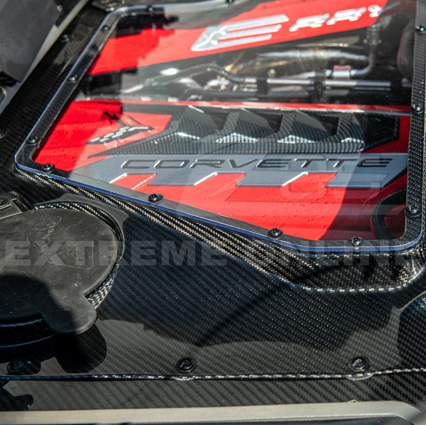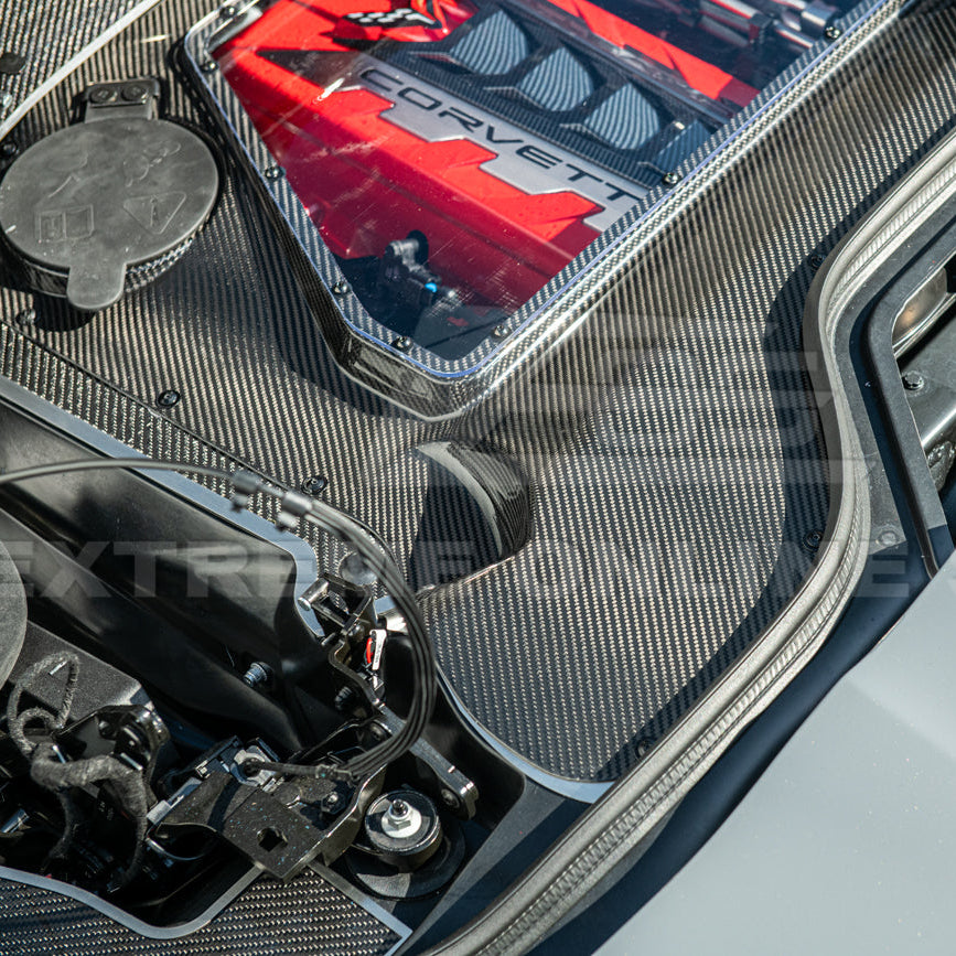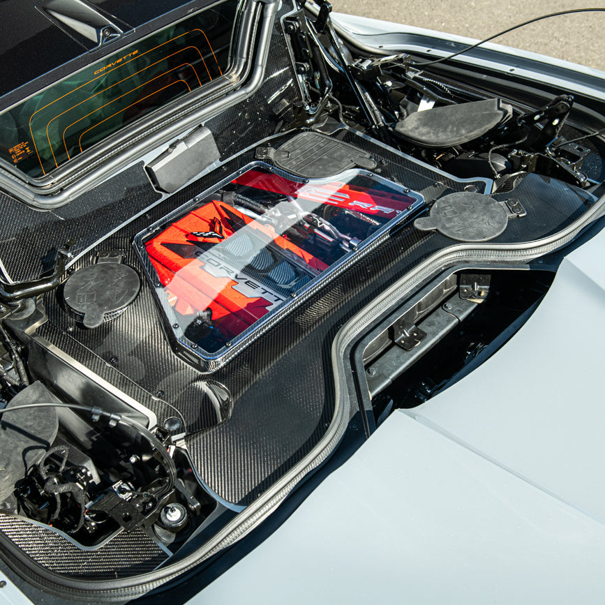 Features a distinctive grained center panel surrounded by exposed carbon fiber weave, creating a luxurious, high-contrast visual effect that elevates the C8’s engine bay.