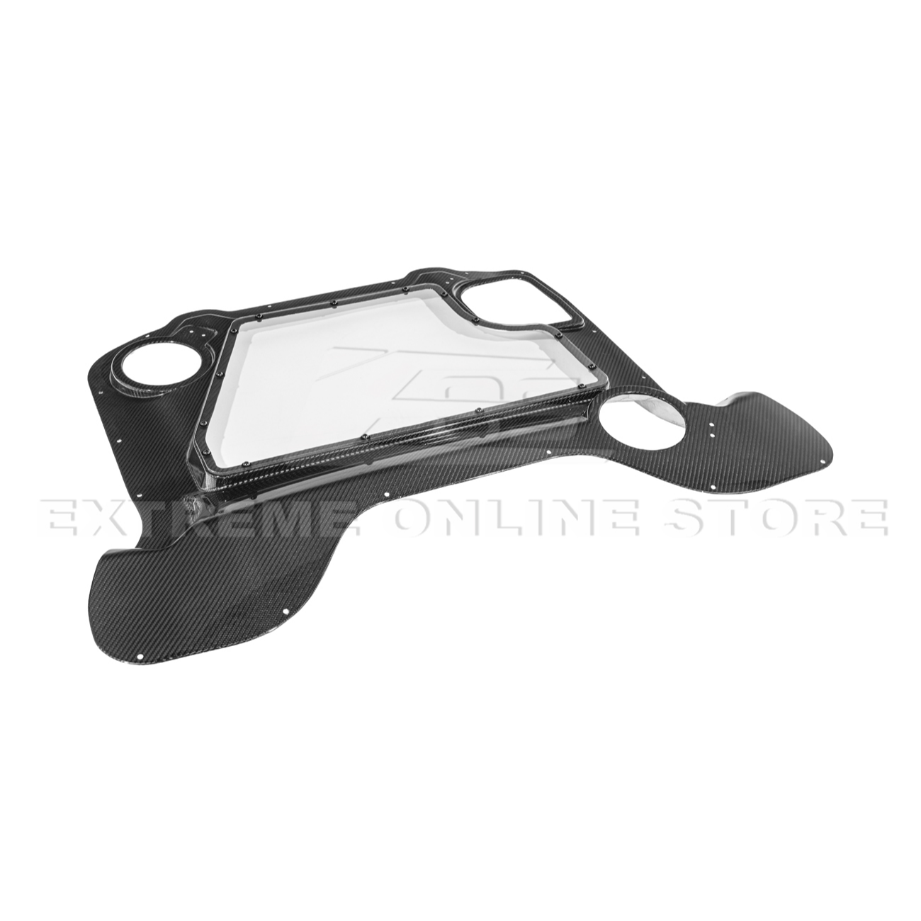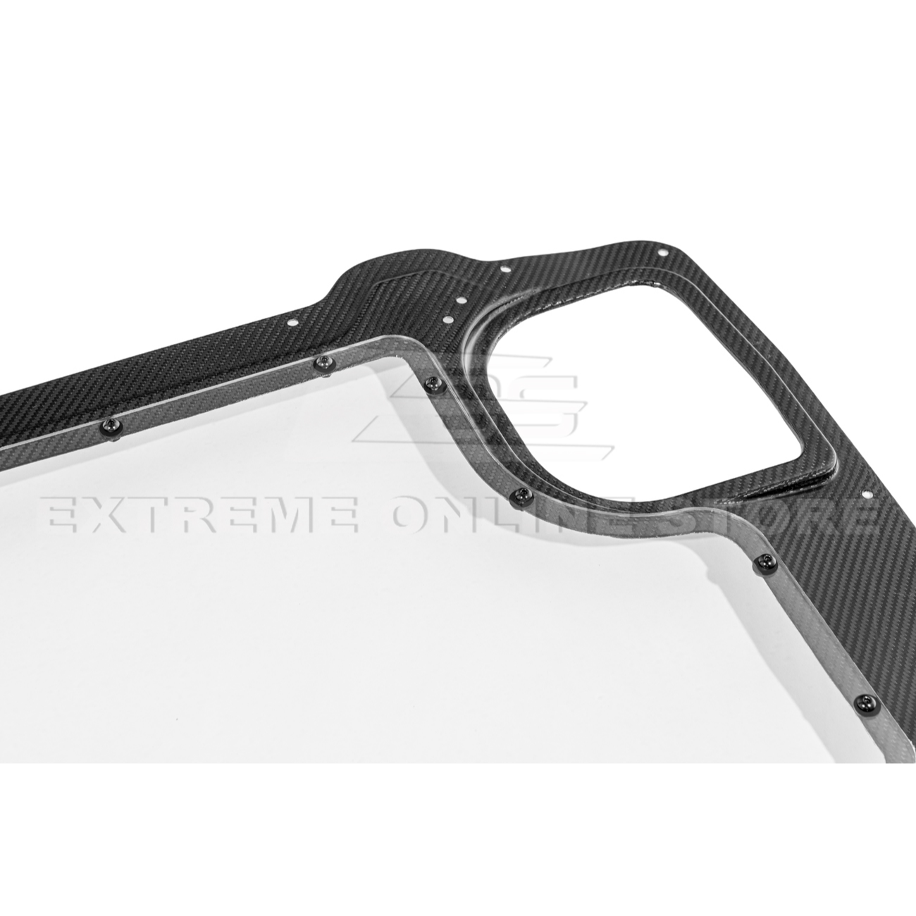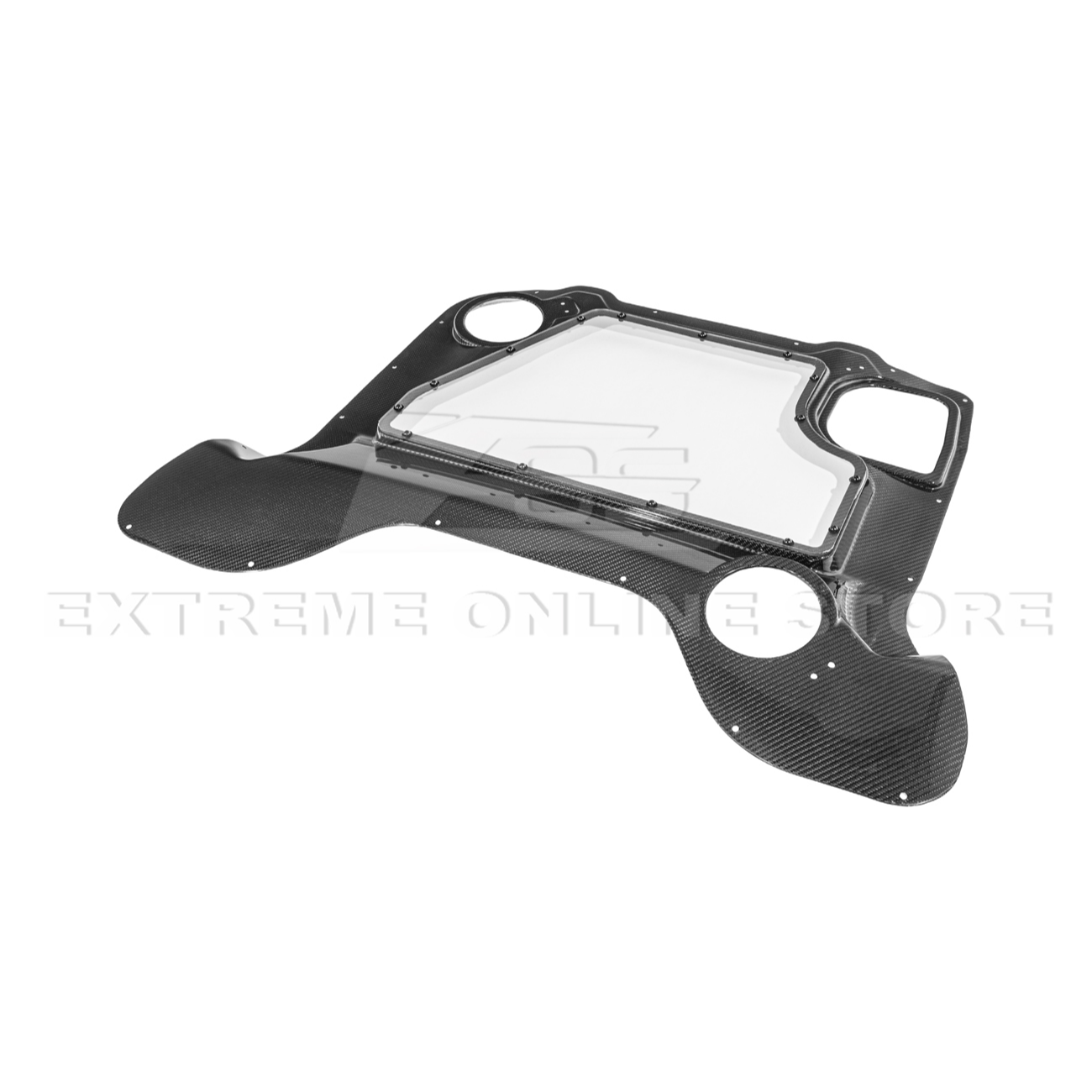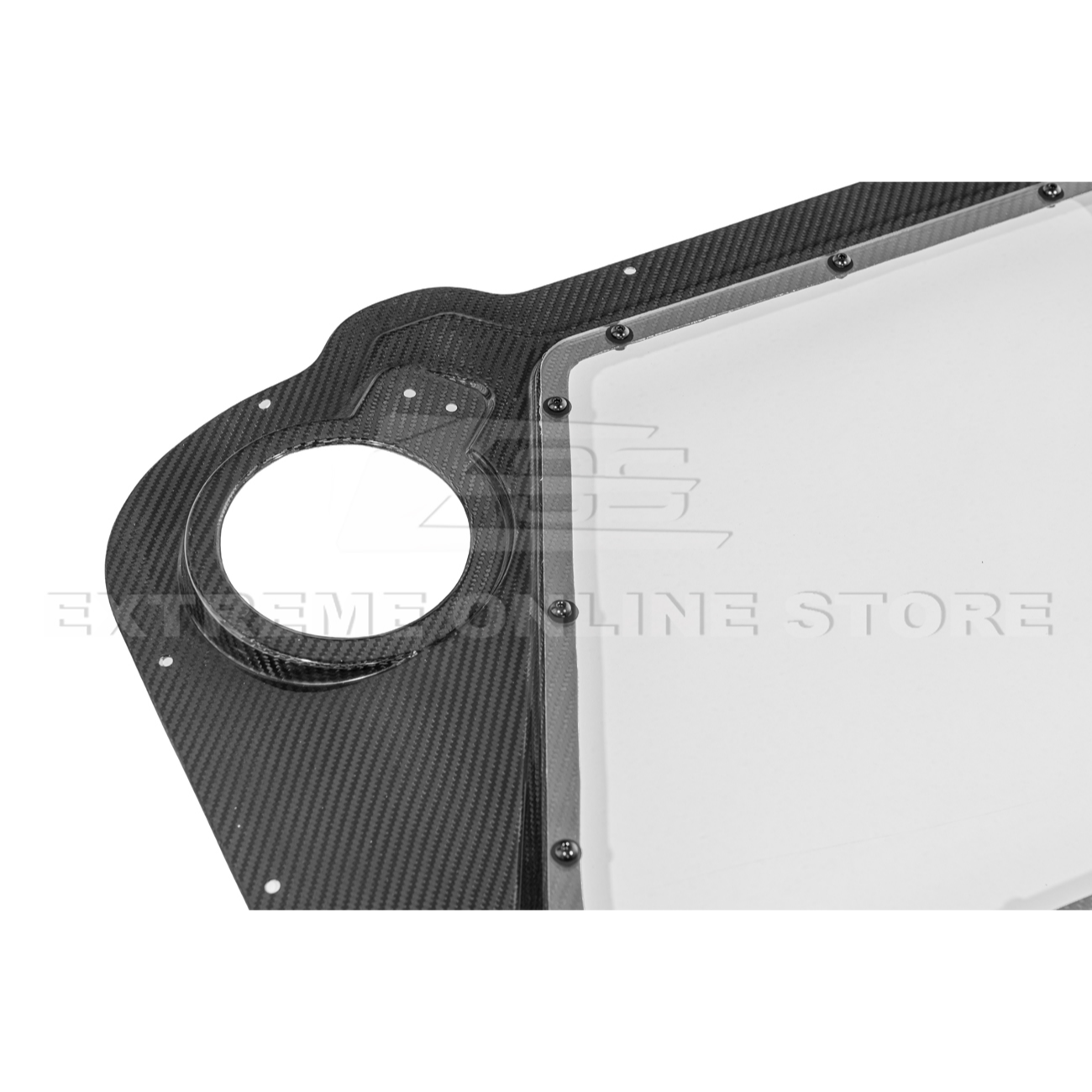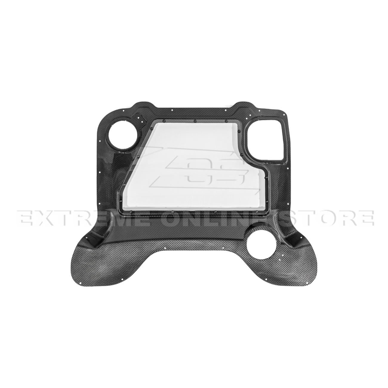 Features a distinctive grained center panel surrounded by exposed carbon fiber weave, creating a luxurious, high-contrast visual effect that elevates the C8’s engine bay.
